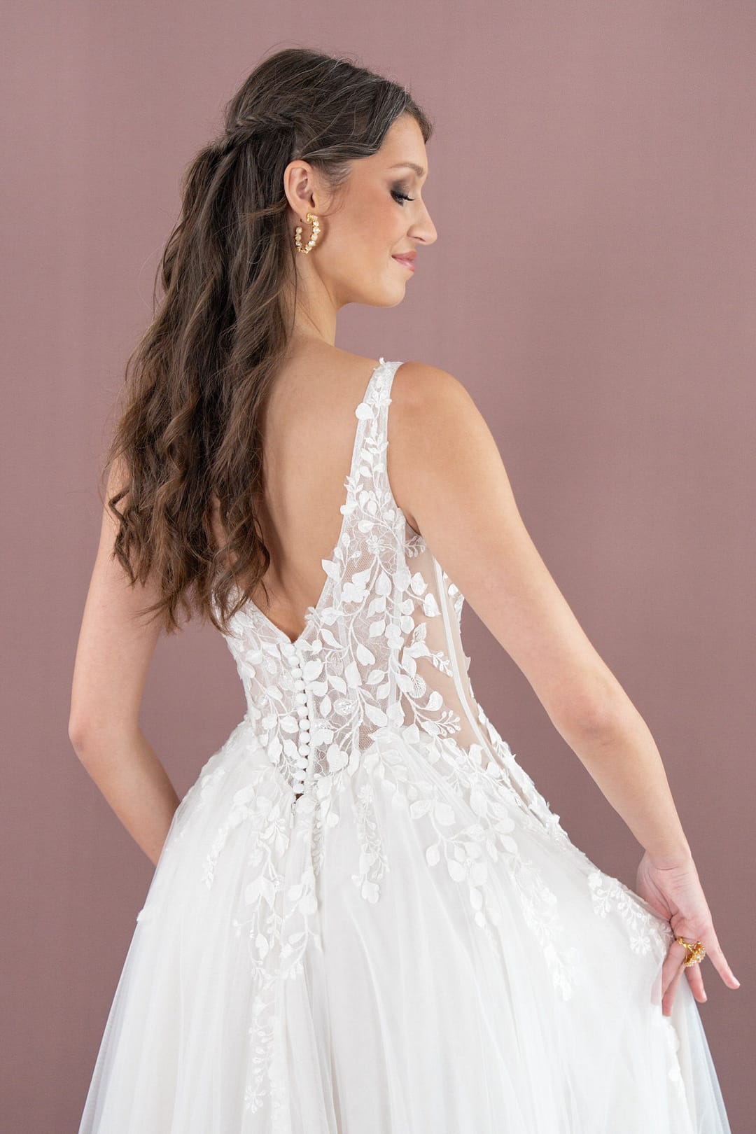 Feine Blätterspitze und kunstvolle Bestickungen zieren das Kleid und verleihen ihm eine natürliche, verspielte Note. Der Illusion-Tüll mit zarter Knopfleiste und raffinierten Cutouts sorgt für aufregende Highlights und unterstreicht den Boho- und Vintage-Stil des Designs. Abnehmbare Ärmel bieten Dir die Möglichkeit, Deinen Look individuell zu gestalten und verleihen dem Kleid zusätzliche Vielseitigkeit.