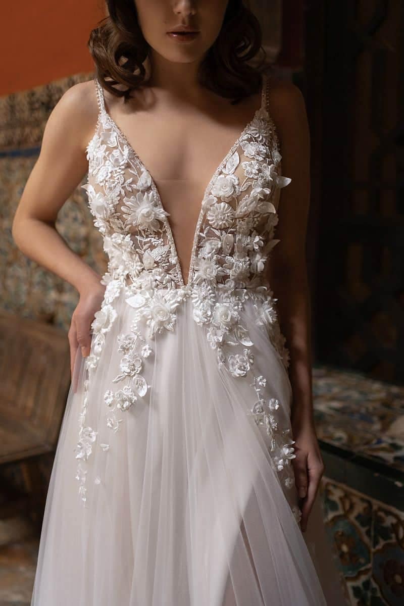 Die V-Cutouts sind ein besonderes Merkmal des Kleides, das dich an diesem unvergesslichen Festtag begleitet.