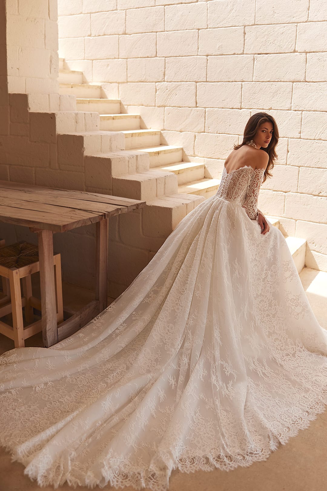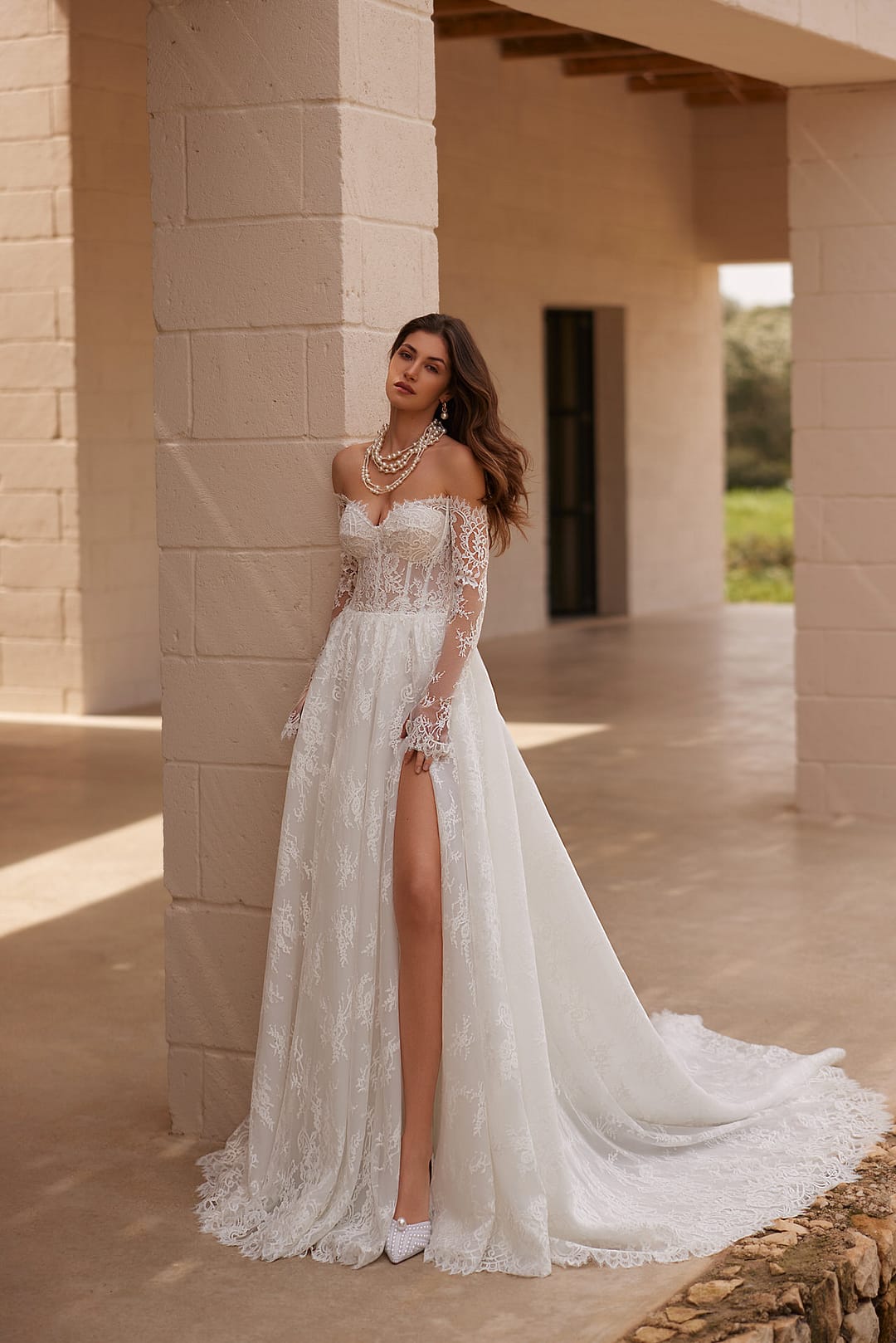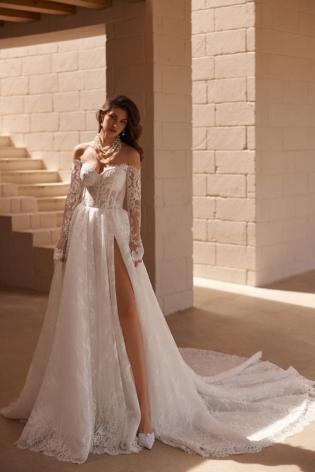 Der Rock ist fließend und weit ausgestellt, was die klassische Prinzessinnen-Form schafft und deine Figur schmeichelnd umhüllt. Ein sexy Schlitz betont dein Bein auf eine subtile, aber aufregende Weise und fügt dem Kleid eine moderne, selbstbewusste Note hinzu. Er mündet in eine lange, spektakuläre Schleppe, die wie ein majestätischer Schleier hinter dir herweht und den Raum mit Pracht erfüllt. Diese Schleppe setzt die pflanzliche Spitzenverzierung nahtlos fort, sodass das gesamte Kleid wie ein harmonisches Kunstwerk wirkt – leicht, luftig und doch voller Tiefe.