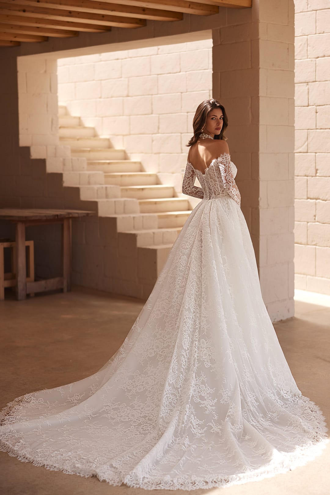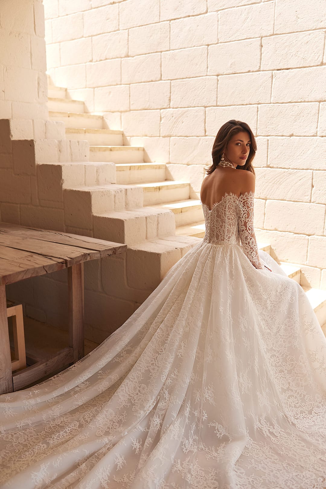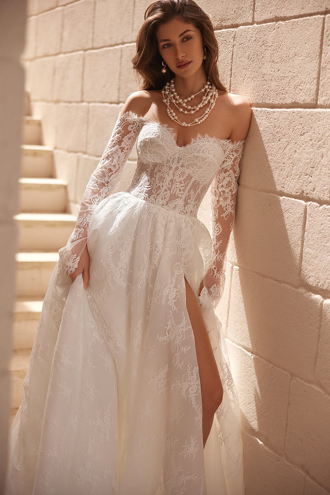 Der Rock ist fließend und weit ausgestellt, was die klassische Prinzessinnen-Form schafft und deine Figur schmeichelnd umhüllt. Ein sexy Schlitz betont dein Bein auf eine subtile, aber aufregende Weise und fügt dem Kleid eine moderne, selbstbewusste Note hinzu. Er mündet in eine lange, spektakuläre Schleppe, die wie ein majestätischer Schleier hinter dir herweht und den Raum mit Pracht erfüllt. Diese Schleppe setzt die pflanzliche Spitzenverzierung nahtlos fort, sodass das gesamte Kleid wie ein harmonisches Kunstwerk wirkt – leicht, luftig und doch voller Tiefe.