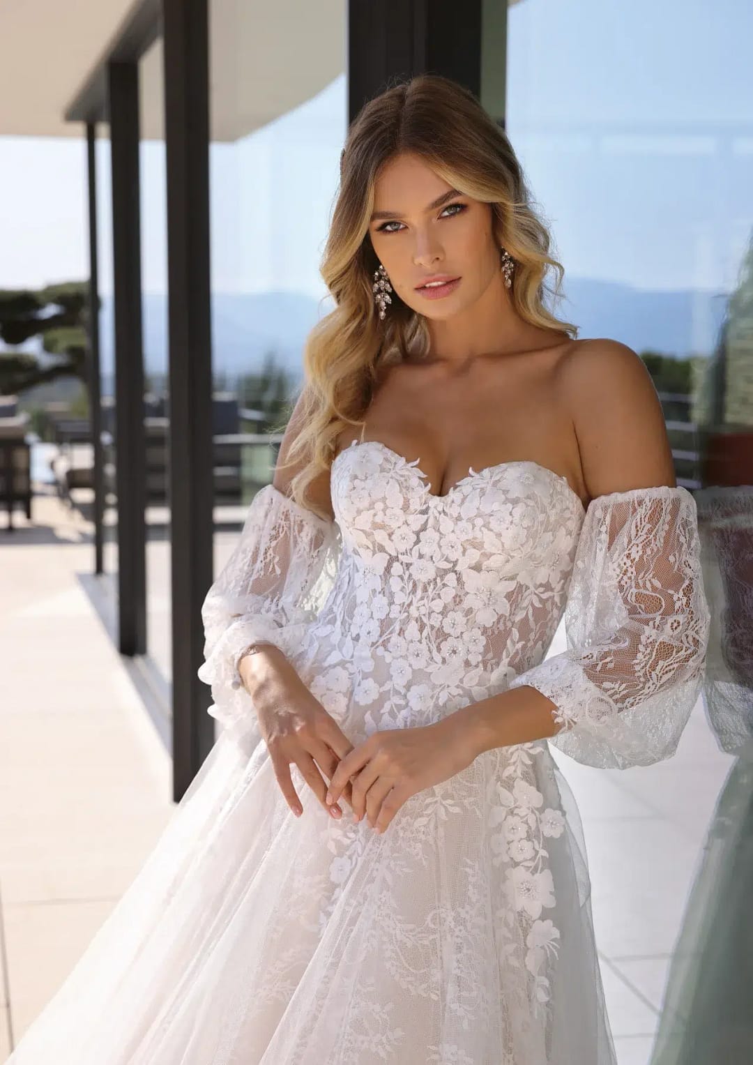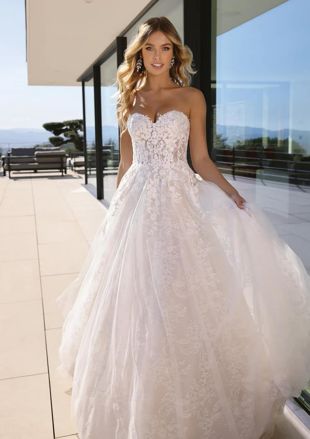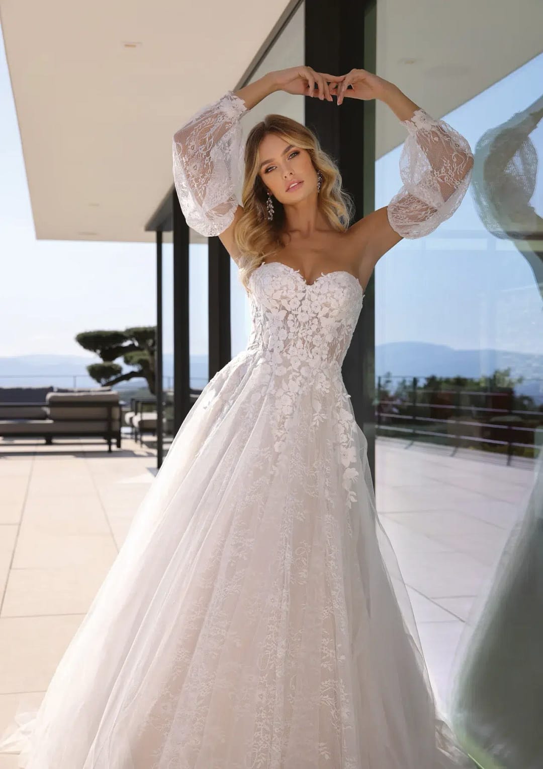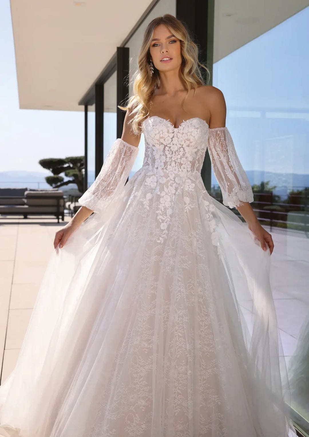 Atemberaubendes Prinzessinnen-Hochzeitskleid mit Illusions-Oberteil, das einen trägerlosen Ausschnitt aufweist und mit floralen Spitzenapplikationen verziert ist. Der Rock ist komplett aus Spitze gefertigt und sorgt für eine verträumte Stimmung. Mit abnehmbaren Ärmeln.