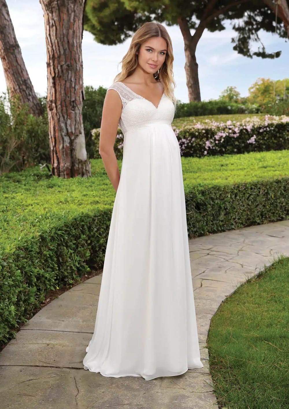 Fließendes A-Linien Hochzeitskleid mit V-Ausschnitt und Riemchenärmeln. Dieses atemberaubende Hochzeitskleid ist aus weichem Chiffon geschneidert, der fließend und elegant ist. Die Taille sitzt vorne hoch, damit der Babybauch bequem sitzt. Die Knopfleiste am Rücken betont die weiblichen Kurven und setzt sie in Szene.