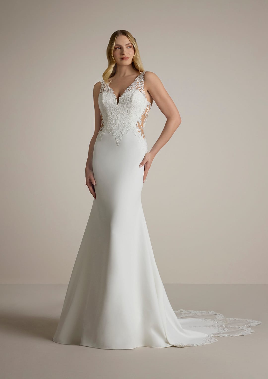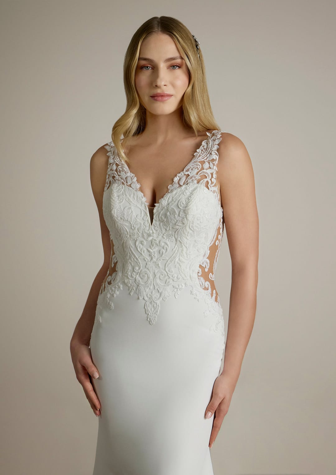 Ein ganz besonderes Highlight ist die kunstvoll gestaltete Rückenpartie. Der aufregende Rücken ist nicht nur ein Blickfang, er bleibt dank der durchscheinenden Stoffe und den bestickten Cut-outs partiell frei, was für einen spektakulären und zugleich elegant anmutenden Effekt sorgt. Diese raffinierte Kombination verleiht dem Kleid das gewisse Etwas und sorgt dafür, dass alle Blicke auf dich gerichtet sind, wenn du den Gang entlang schreitest.