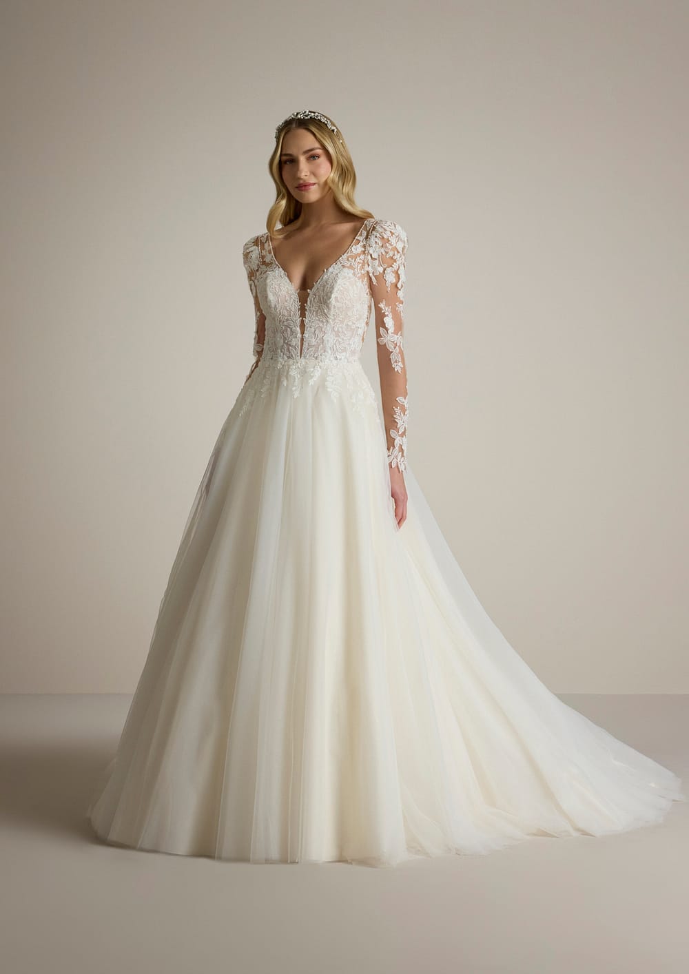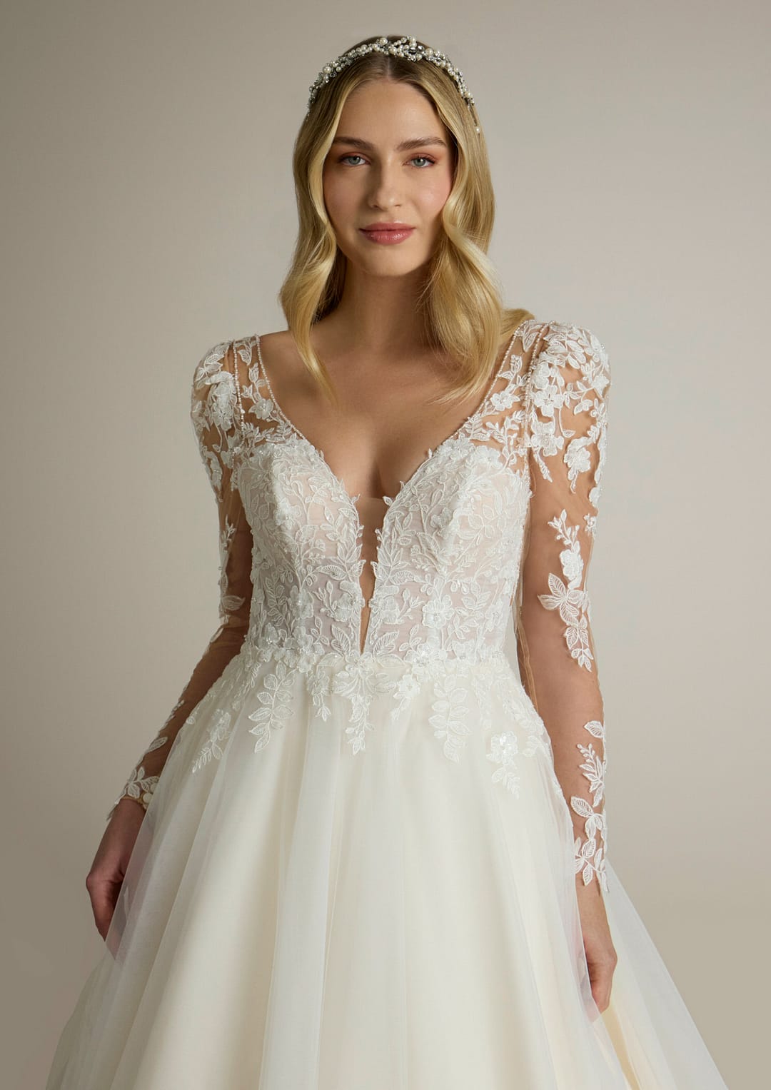 Die sanft fließende A-Linien-Silhouette schmeichelt deiner Figur und sorgt dafür, dass du dich an deinem besonderen Tag rundum wohlfühlst. Der zauberhafte V-Ausschnitt des Mieders gibt deinem Dekolleté eine subtile, aber glamouröse Note, während die filigrane Spitze und die kunstvollen Perlenverzierungen den Look perfekt abrunden und die Blicke auf sich ziehen.