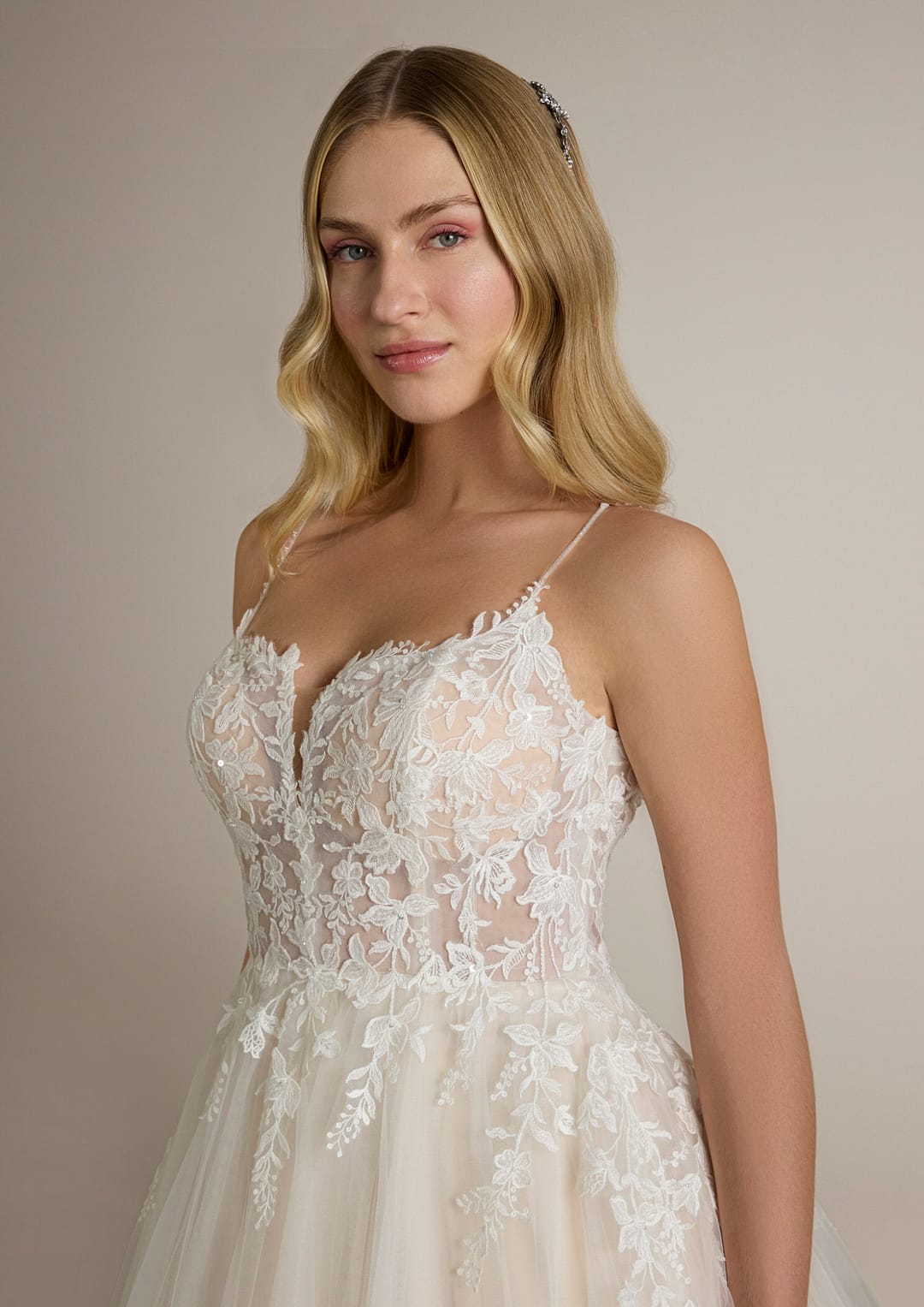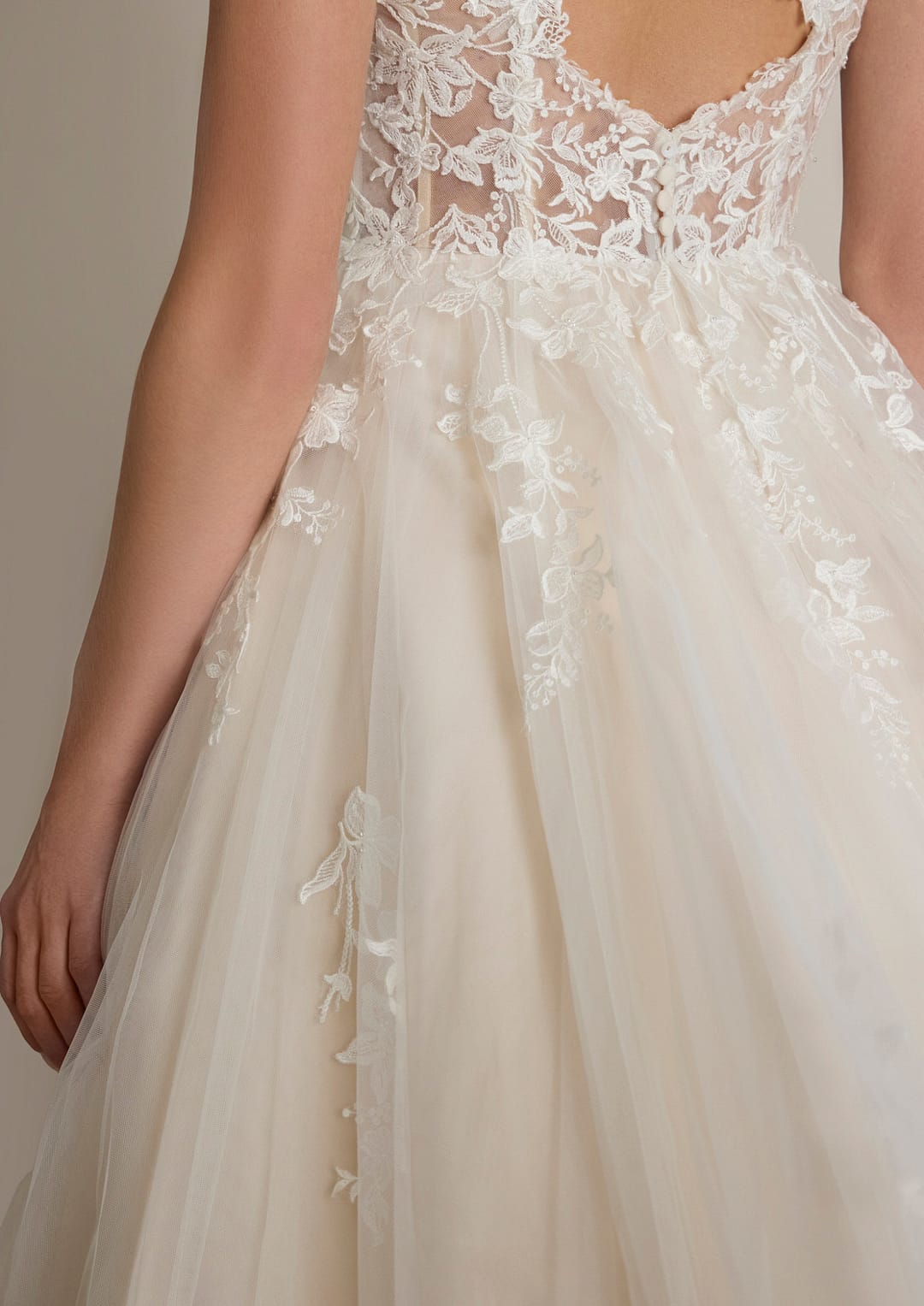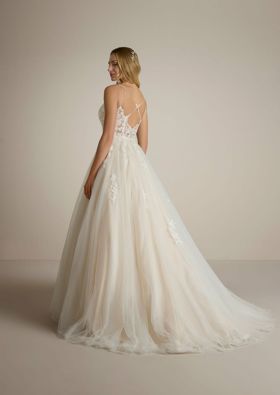 Doch das Besondere dieses Kleides liegt nicht nur im freundlichen Vorderteil, sondern auch im verspielten, überkreuzten Rücken. Die exquisiten Schmuckträger, die sich elegant im Rücken kreuzen, sorgen für einen atemberaubenden Effekt und legen sich sanft auf deine Haut – ein Must-Have für jede romantische Braut.