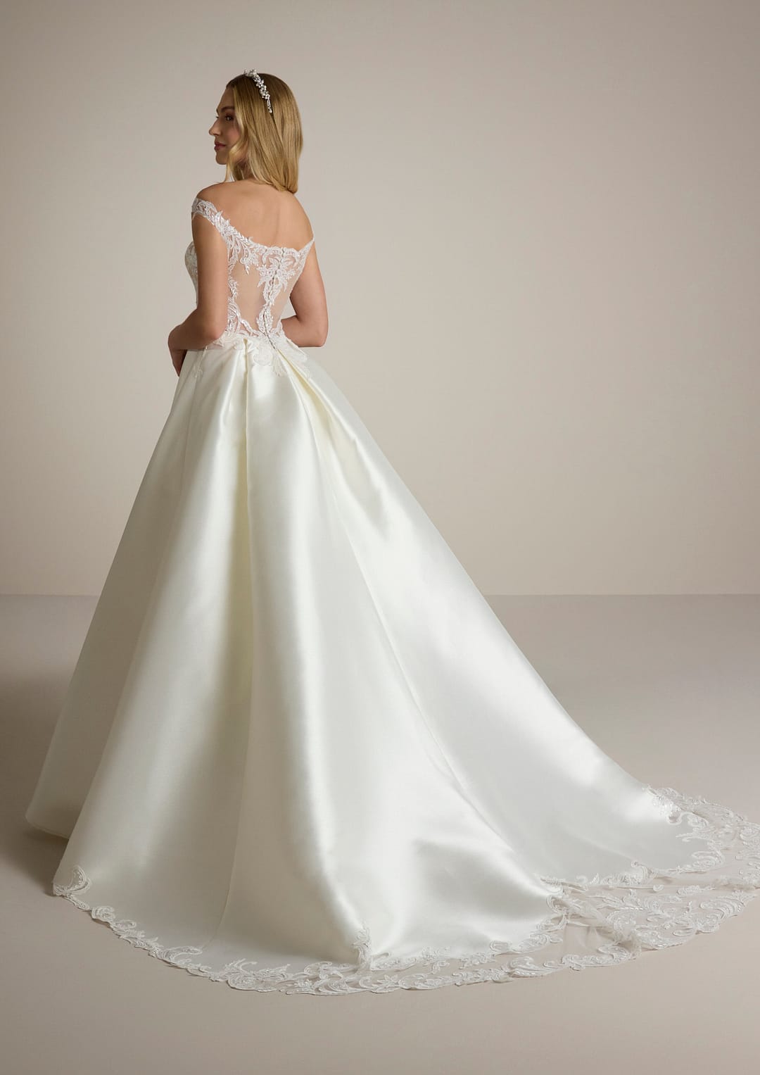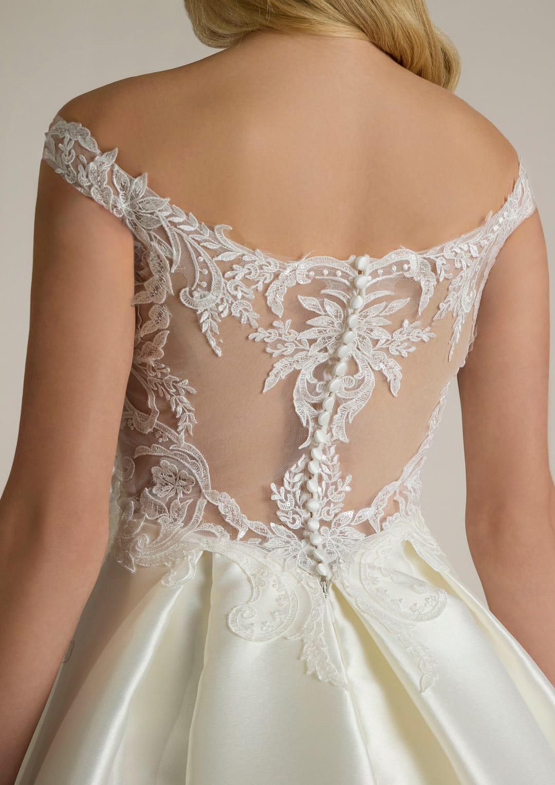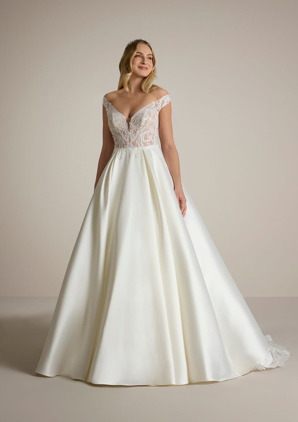 Der Rock aus edlem Mikado-Stoff fließt sanft zu Boden und bringt seine schlichte Schönheit perfekt zur Geltung. Er besitzt einen speziellen Spitzenbesatz, der dem Gesamtbild eine verspielte Note verleiht und das Kleid in seiner Gesamtheit auf traumhafte Art und Weise ergänzt. Jedes Detail wurde so sorgfältig durchdacht, dass du dich in diesem Moment wie eine echte Prinzessin fühlen wirst.