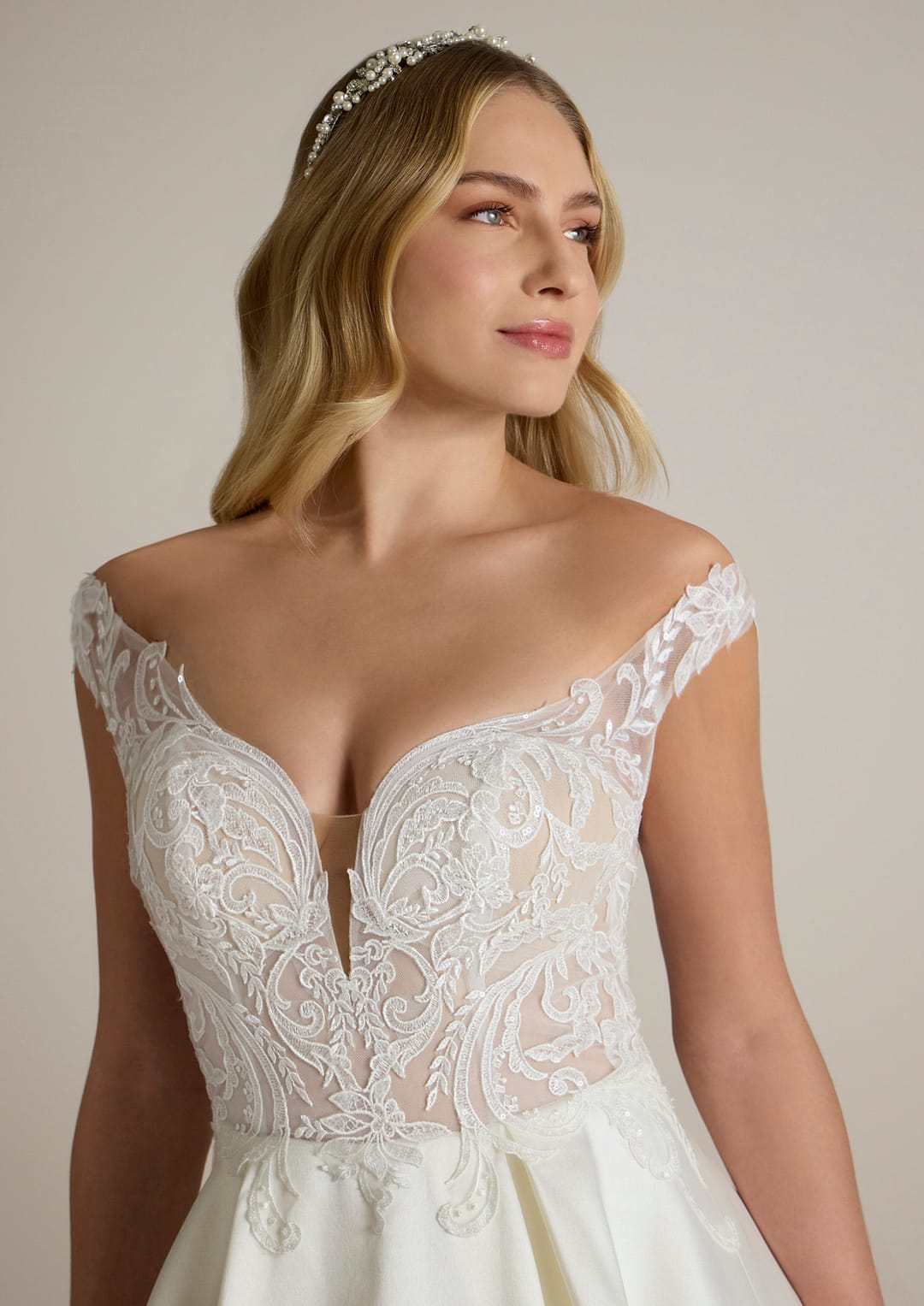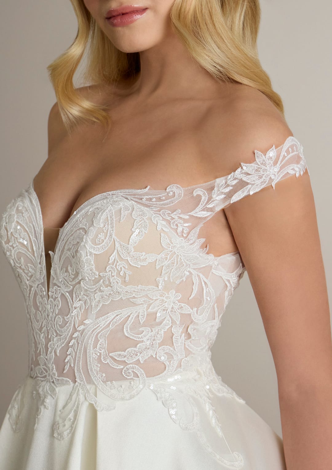 Das Mieder des Kleides, kunstvoll gefertigt aus feiner bestickter Spitze, hüllt dich in einen Hauch von Eleganz und Raffinesse. Die zarten Perlenapplikationen, die dem Tüll hinzugefügt wurden, verleihen diesem Modell einen Hauch von Glamour und glänzen mit jedem Lichtstrahl, als ob sie für dich geschaffen wurden. Der tief angesetzte V-Ausschnitt betont dezent dein Dekolleté und sorgt für eine romantische Ausstrahlung, ohne aufdringlich zu sein.