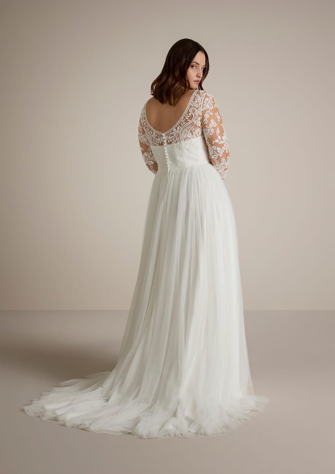 Der fließende A-Schnitt gibt dir nicht nur Freiheit in deinen Bewegungen, sondern sorgt auch für eine romantische Ausstrahlung, die dich auf deinem großen Tag strahlen lässt. Der Rücken des Kleides ist mit einem schlichten Rundausschnitt gestaltet und rundet den gesamten Look harmonisch ab.