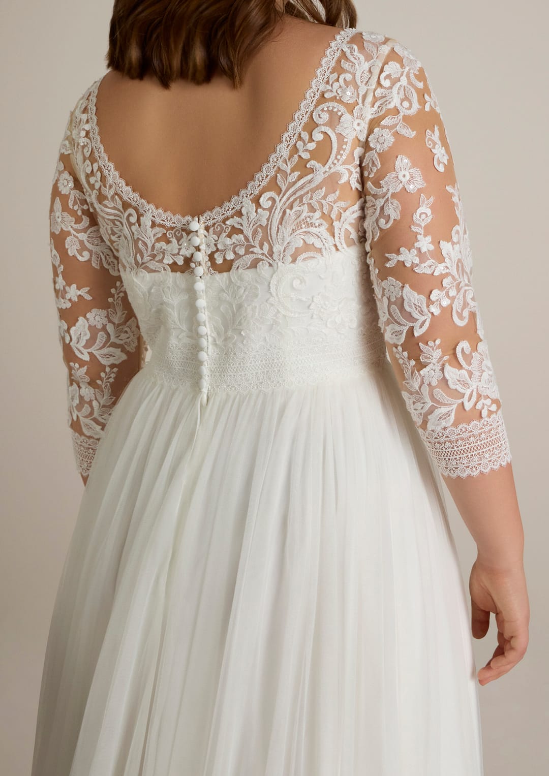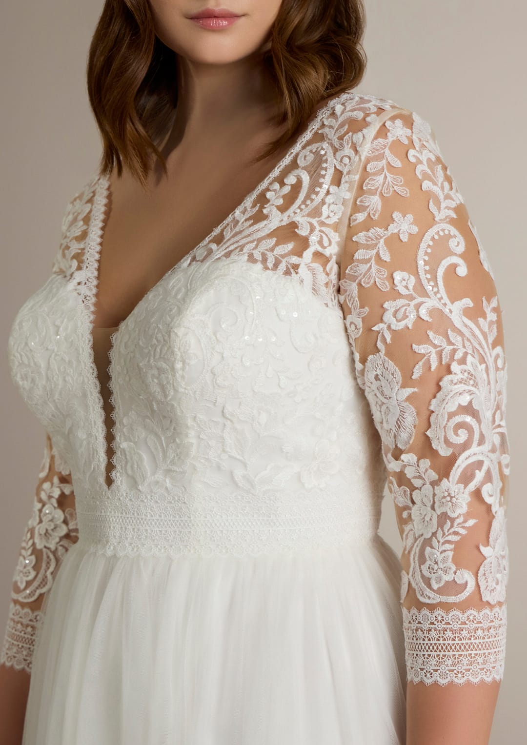Die Dreiviertelärmel verleihen dem Gesamtdesign eine anmutige Note. Sie sind aus transparentem Stoff gefertigt und tragen eine liebevolle Blumenstickerei, die dein Braut-Outfit mit einem Hauch von Verspieltheit und Feminität komplettiert. Diese detailverliebte Ausarbeitung sorgt dafür, dass du nicht nur einmal umschaut wirst, sondern alle Blicke nur auf dich gerichtet sind.