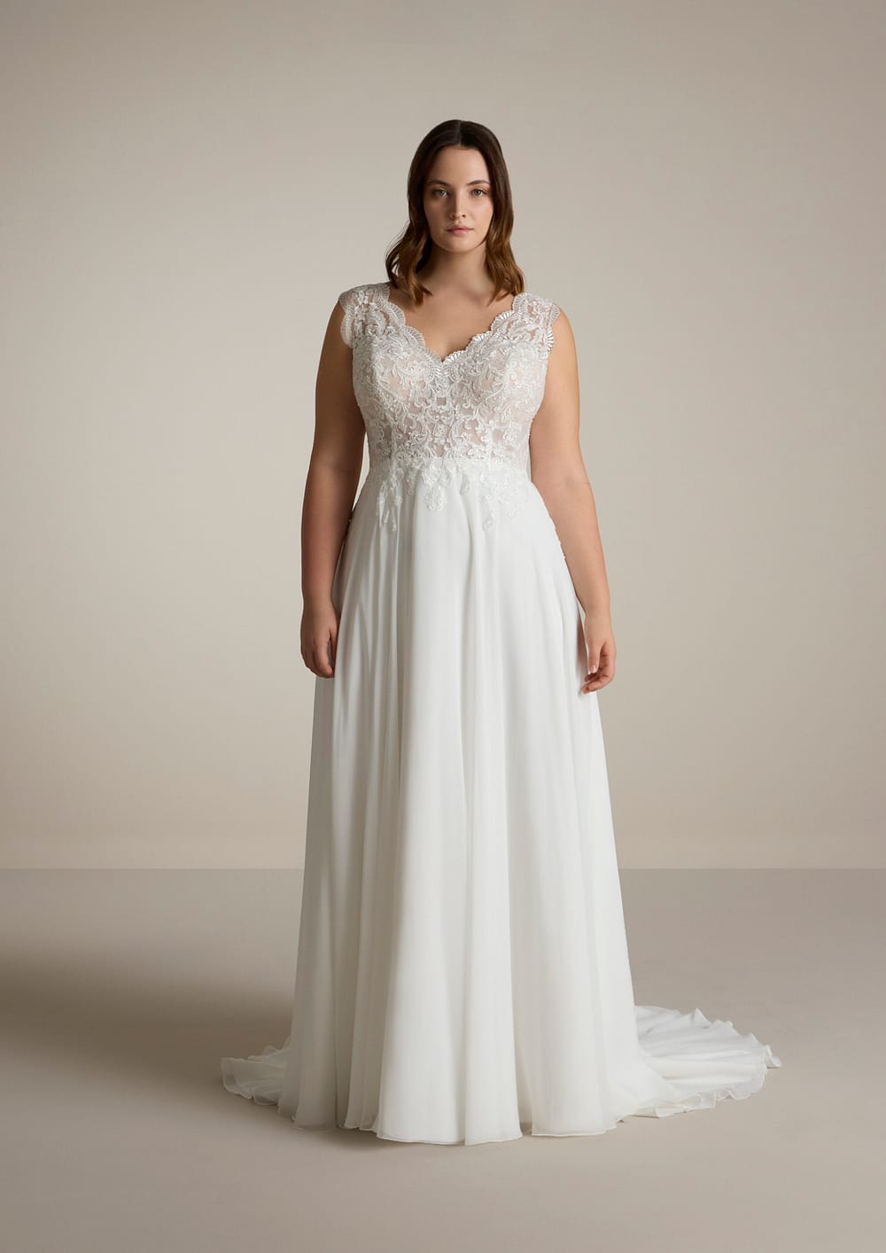 Das atemberaubende A-Linien-Plus Size Brautkleid Ladybird Wasan wird dich mit seinem eleganten Charme und seinem zauberhaften Design verzaubern. Der romantische V-Ausschnitt und die feinen Träger verleihen dir nicht nur eine feminine Silhouette, sondern sorgen auch für einen Hauch von Leichtigkeit, der ideal für deinen großen Tag ist.