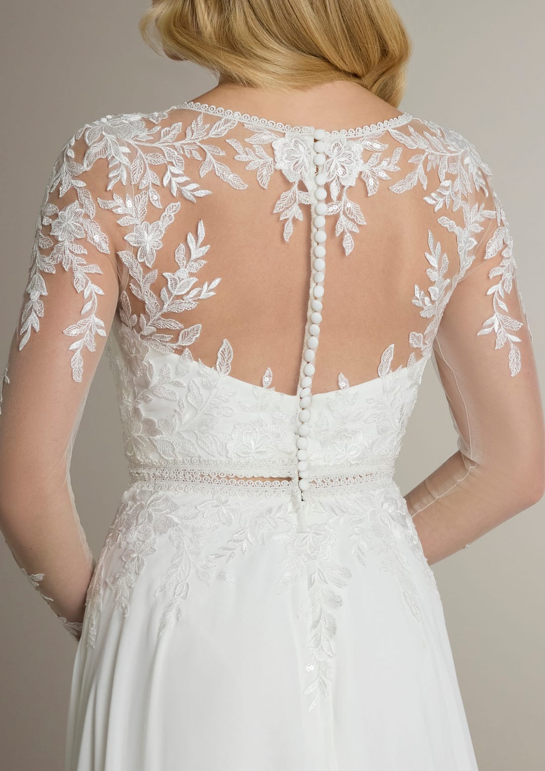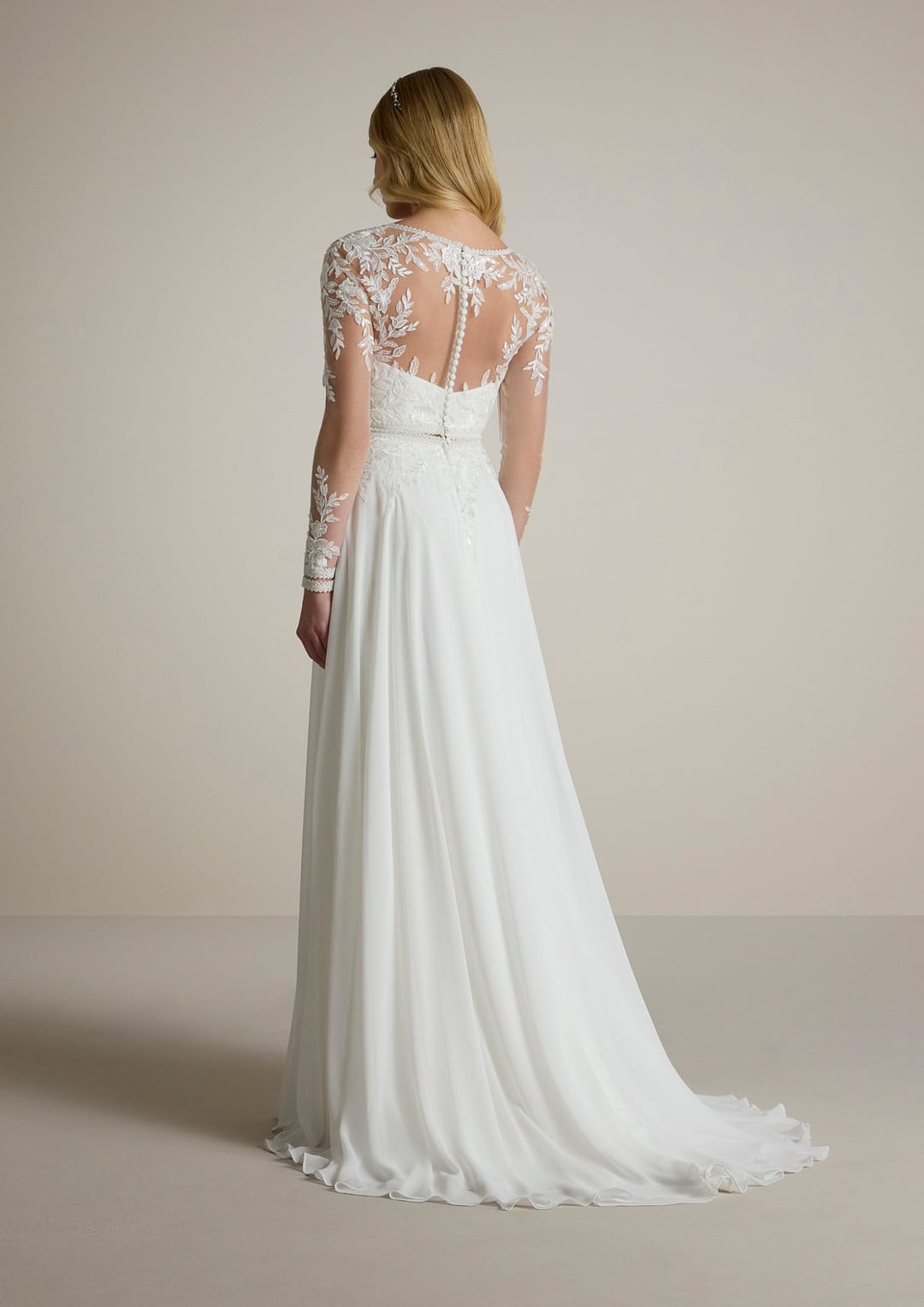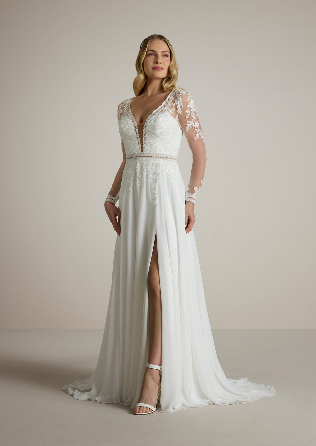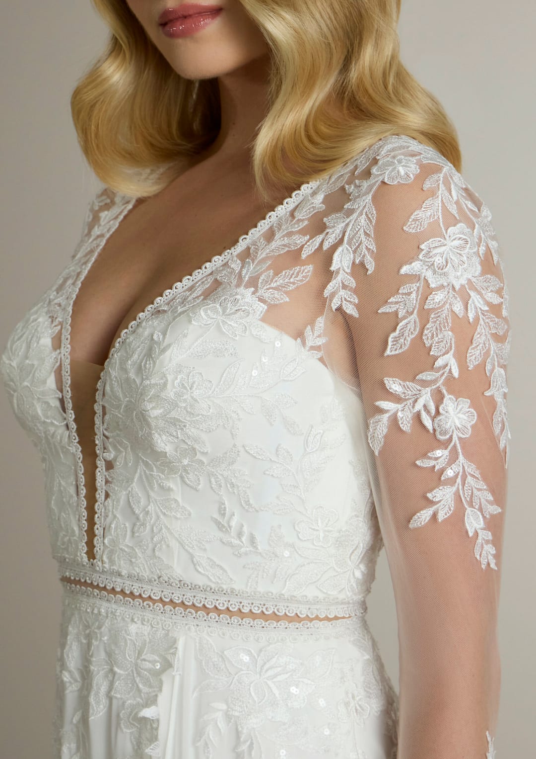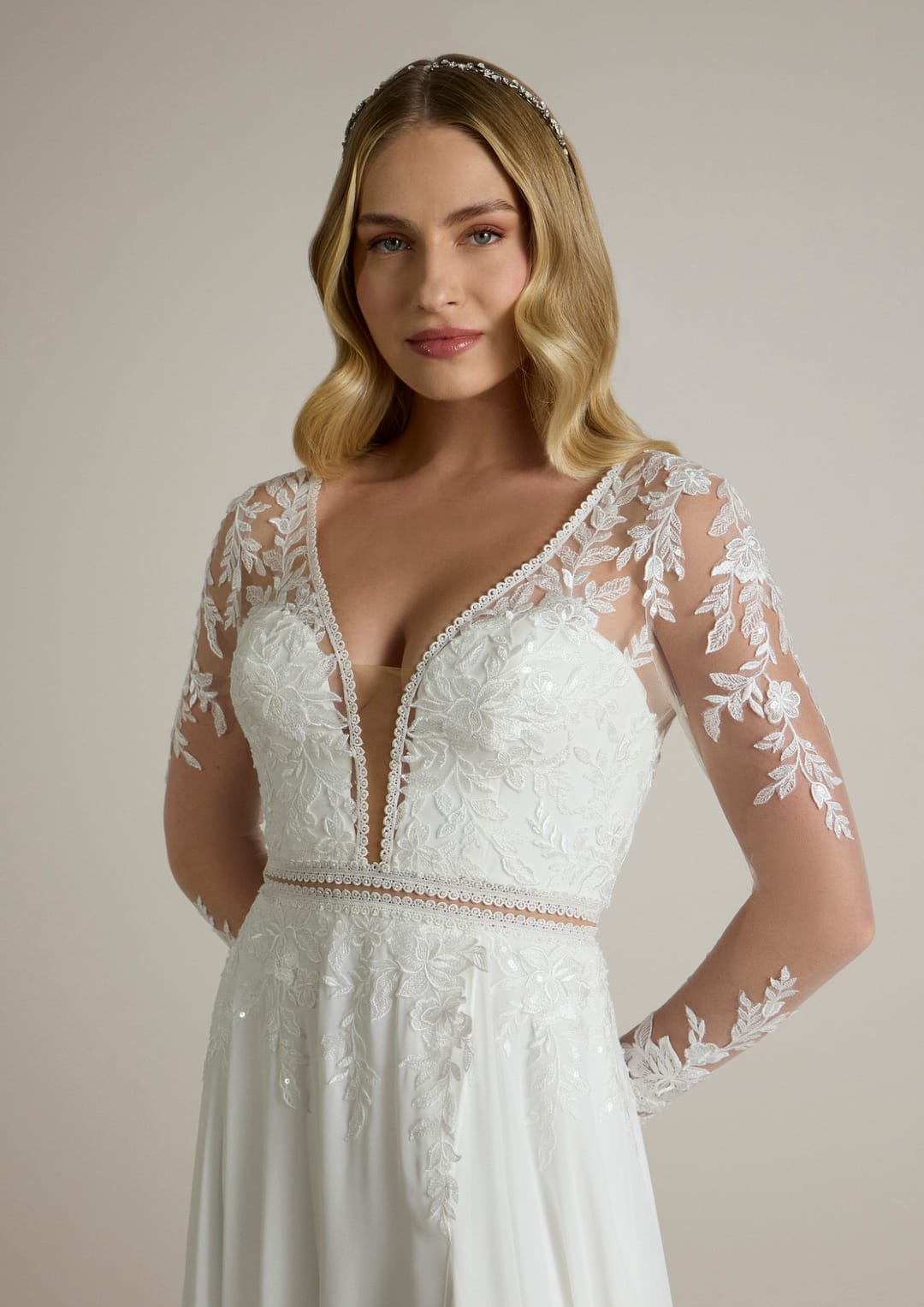 Lass dich verzaubern von unserem Ladybird Wish Brautkleid, das pure Eleganz und romantische Raffinesse in sich vereint. Mit seinem fließenden A-Linienschnitt und dem atemberaubenden V-Ausschnitt wirst du an deinem großen Tag einfach umwerfend aussehen. Die langen Ärmel, geschmückt mit filigran aufgestickten Blumen auf transparentem Stoff, verleihen dem Kleid einen zauberhaften Charme und machen dich zur strahlenden Braut, von der du immer geträumt hast.
