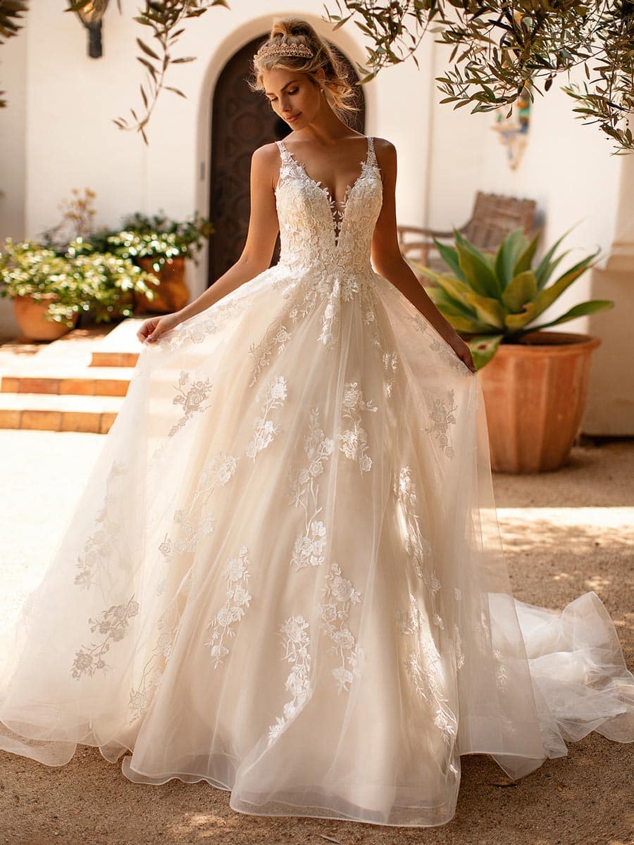 Mit dem Kleid Moonlight Bridal J6781 in A-Linie wird dein Gang zum Hochzeitsaltar unvergesslich.