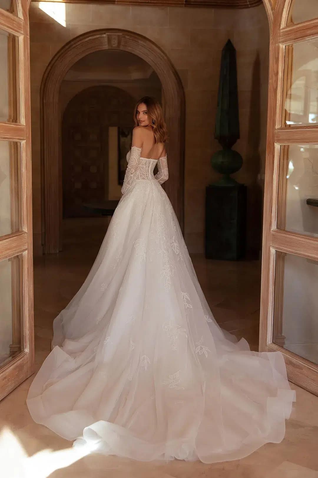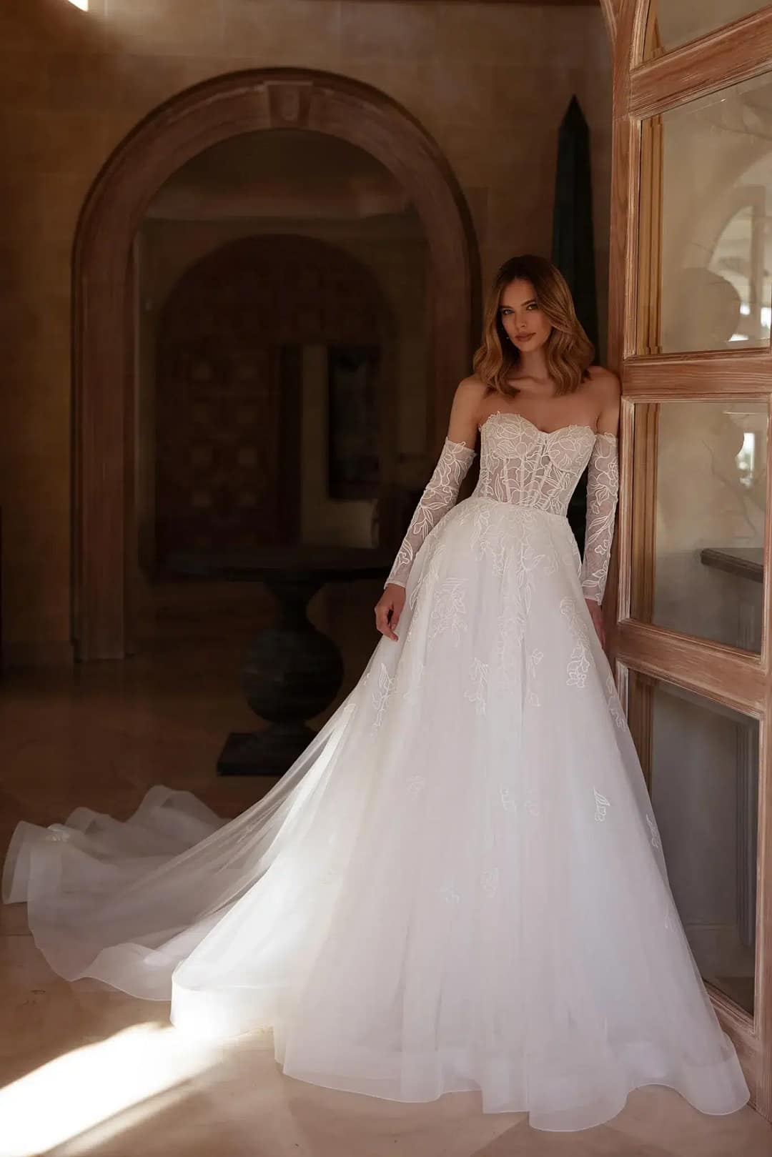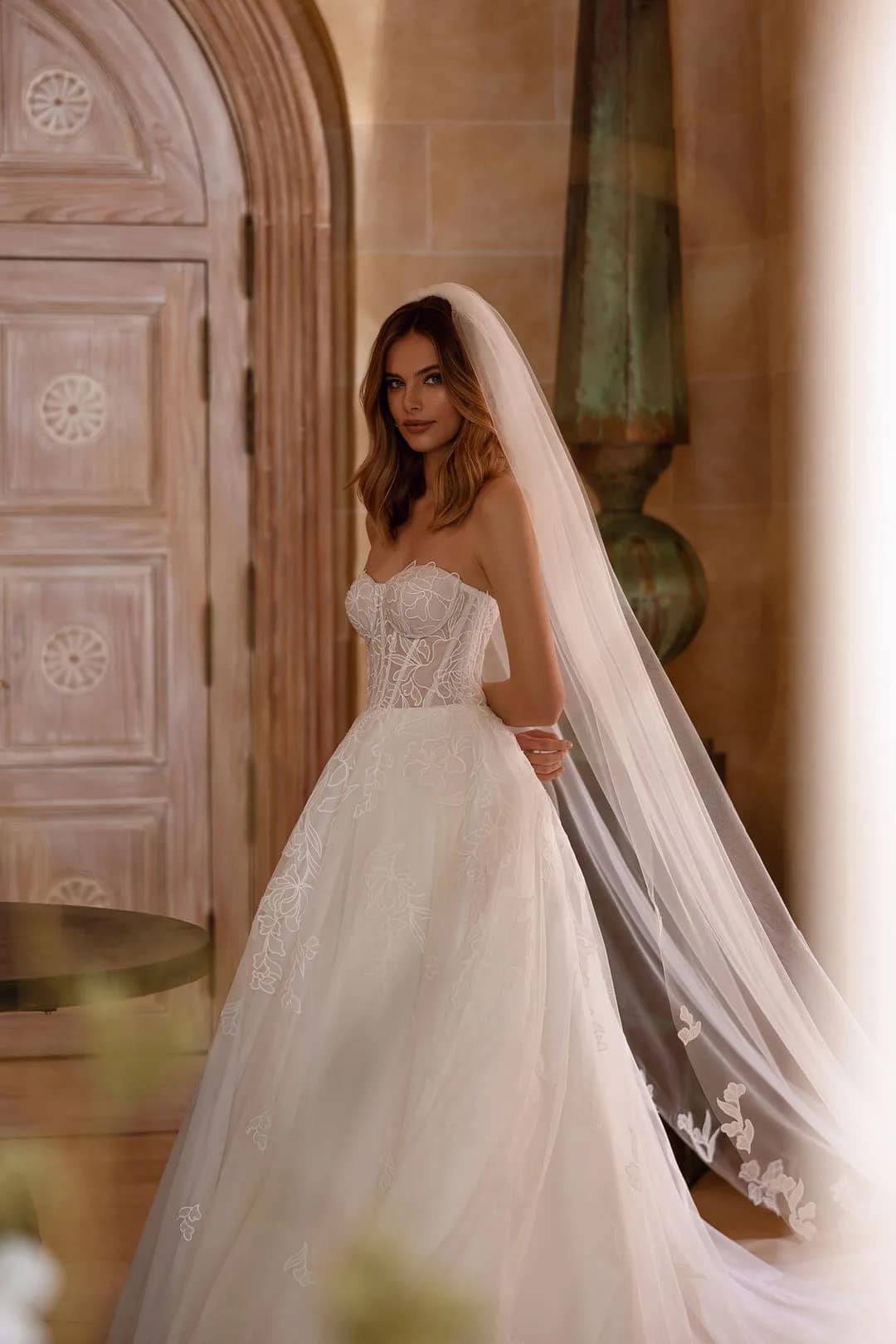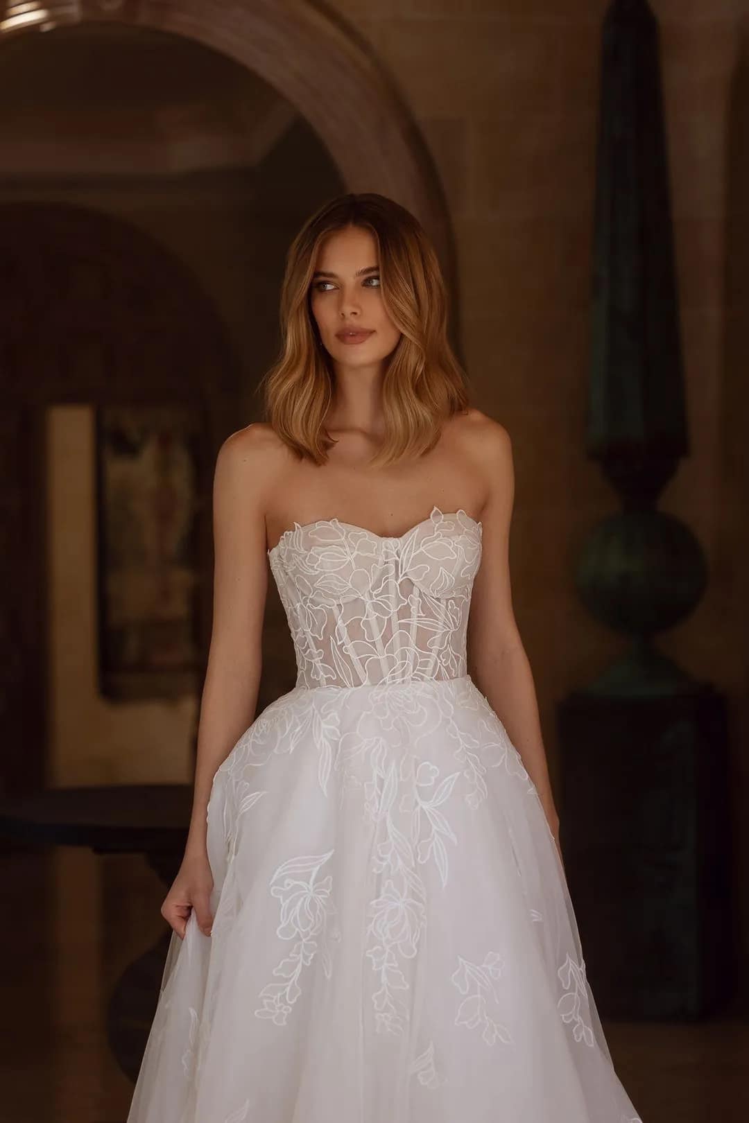 Das himmlische Brautkleid von Blair ist der Inbegriff von Zartheit und Anmut. Das trägerlose Korsett mit Stäbchen und definierten Brustkörbchen ergänzt perfekt den Rock in A-Linie, der aus feinem, mit Blumen gemustertem Spitzenmaterial gefertigt ist. Abnehmbare Ärmel präsentieren Vielseitigkeit und Launenhaftigkeit und gestatten es der Braut, ihren Look für verschiedene Momente ihres besonderen Tages anzupassen. Die kapellenlange Schleppe verleiht dem Kleid einen Hauch von Erhabenheit, während eine Rosshaarflechte am Saum dem Rock Struktur und Volumen verleiht. Ein passender Schleier rundet den Look ab und unterstreicht die Gesamtästhetik des Stils.