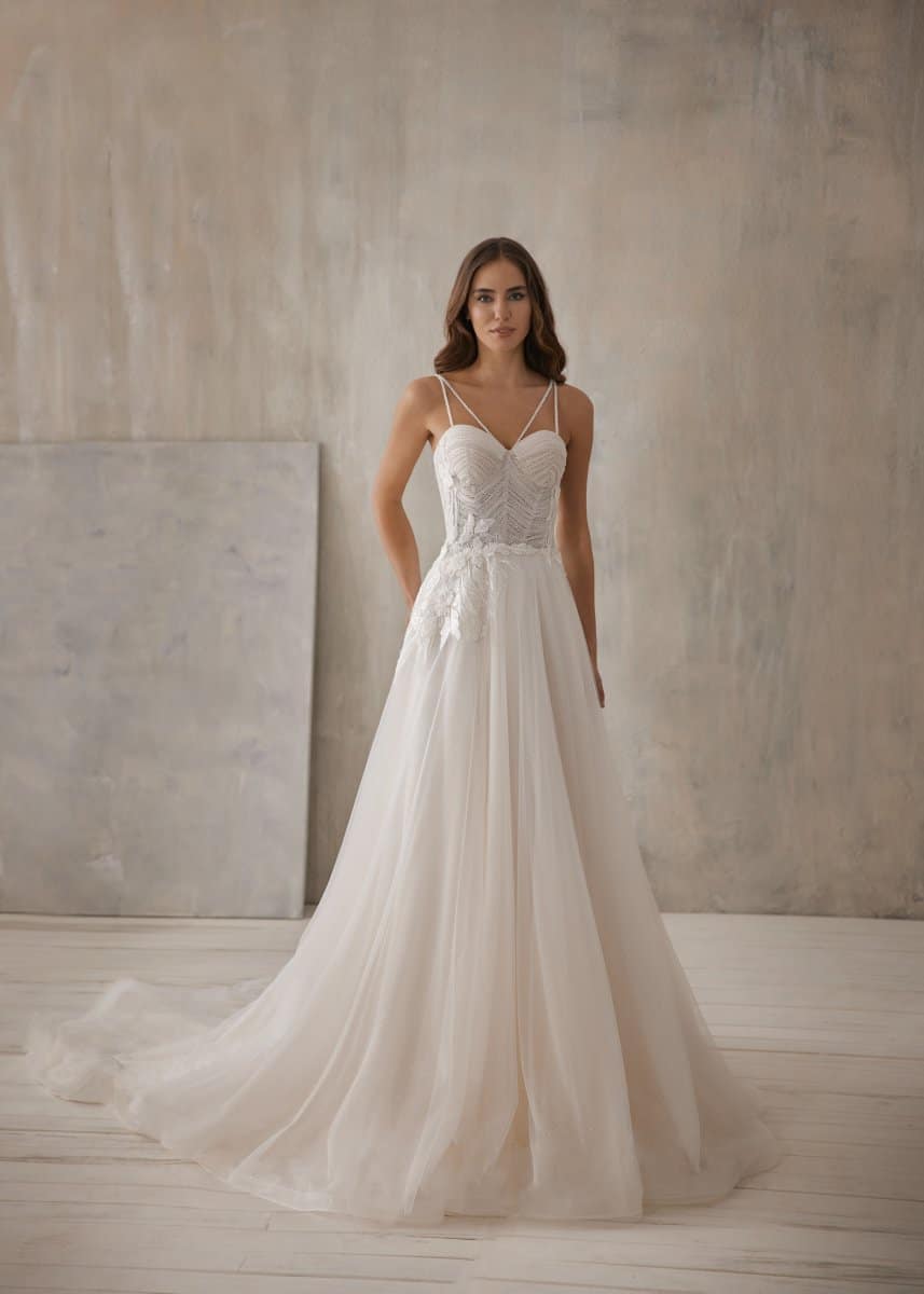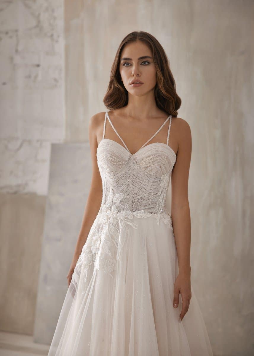 Mit dem Kleid Olympia Sposa 14AD in A-Linie wird dein Gang zum Hochzeitsaltar unvergesslich.