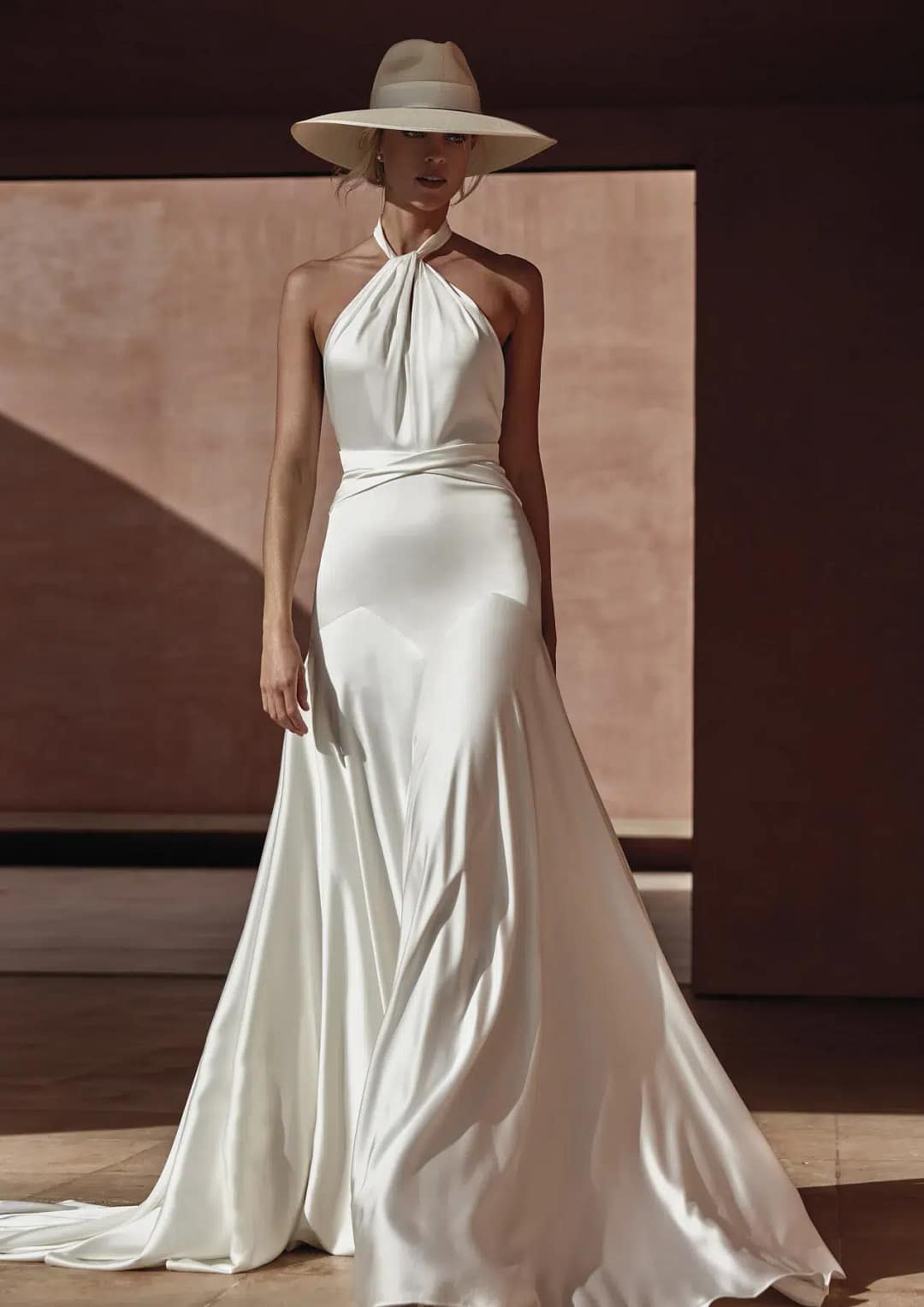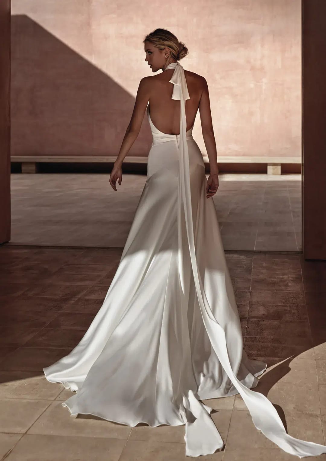 Ein atemberaubendes, minimalistisches Design, das einfach herrlich bewegt und verlaufen kann. Fühle dich wie ein Laufstegmodel (aber bequem) in dieser trendigen Kreation aus Satin mit modernem Neckholder und niedriger Taille. In diesem vielseitigen Stunner kannst du mit Leichtigkeit über den Traualtar schreiten und tanzen.