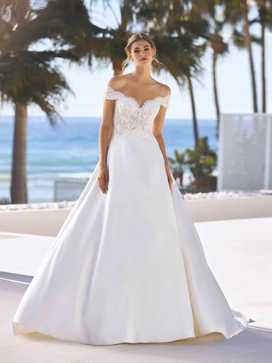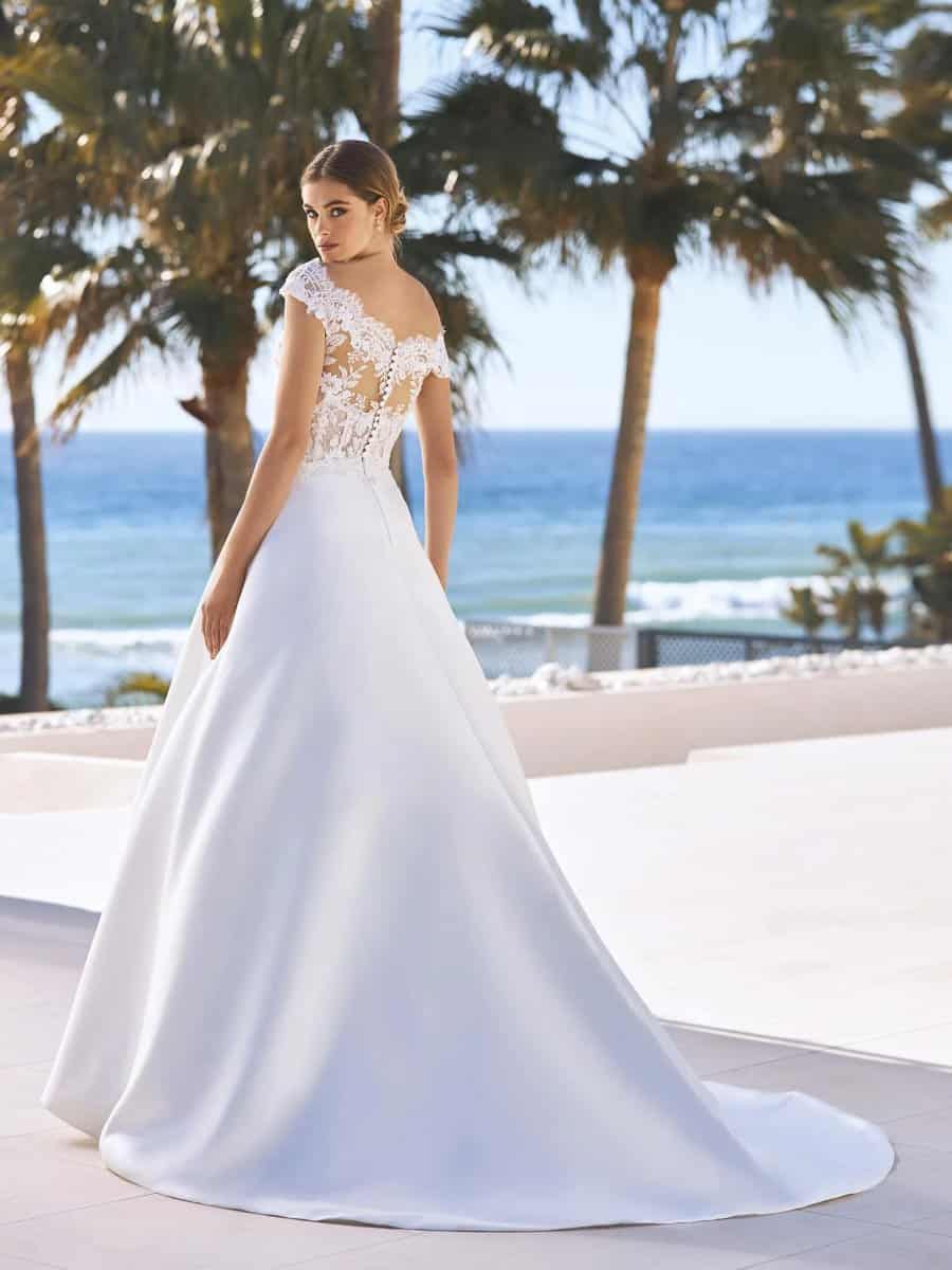 Mit dem Modell Pronovias Edie in A-Linie wird dein Gang zum Altar unvergesslich.