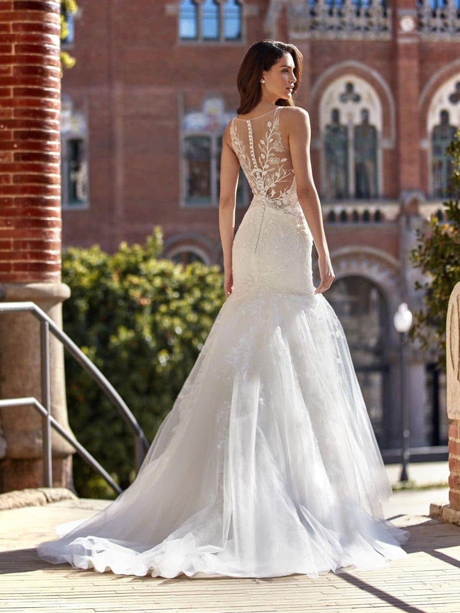 Du magst es atemraubend und mondän? Dann ist Pronovias SE15 im Mermaid-Look das richtige Modell für dich.