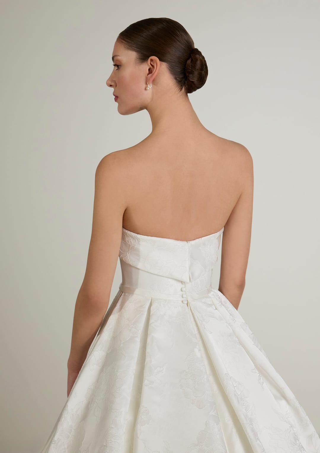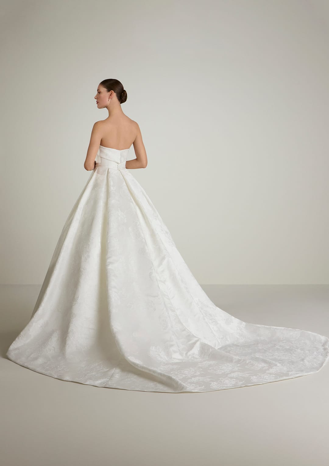 Das AIDAY begeistert mit seiner zauberhaften Prinzessin-Silhouette, die durch den voluminösen Rock in voller Pracht zur Entfaltung kommt. Jeder Schritt wird zum Erlebnis – die fließenden Linien und der majestätische Stoff kreieren eine Aura von Anmut und Eleganz, die dich in den Mittelpunkt rückt. Die Verarbeitung aus erlesenem Jacquard-Stoff sorgt für ein hochwertiges Tragegefühl und eine traumhafte Optik, die deinen großen Tag unvergesslich machen wird.