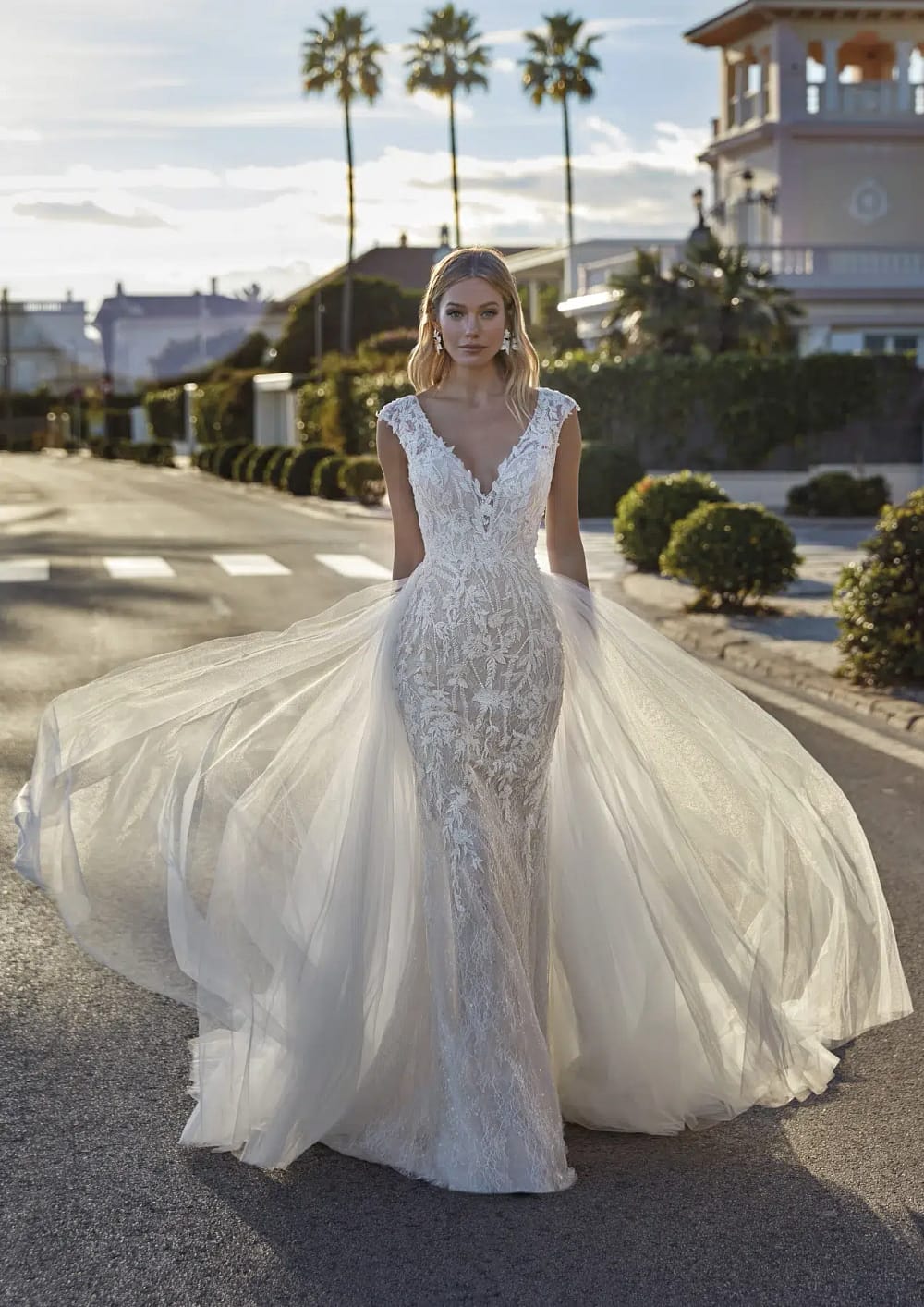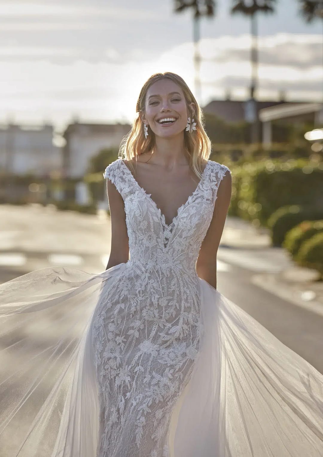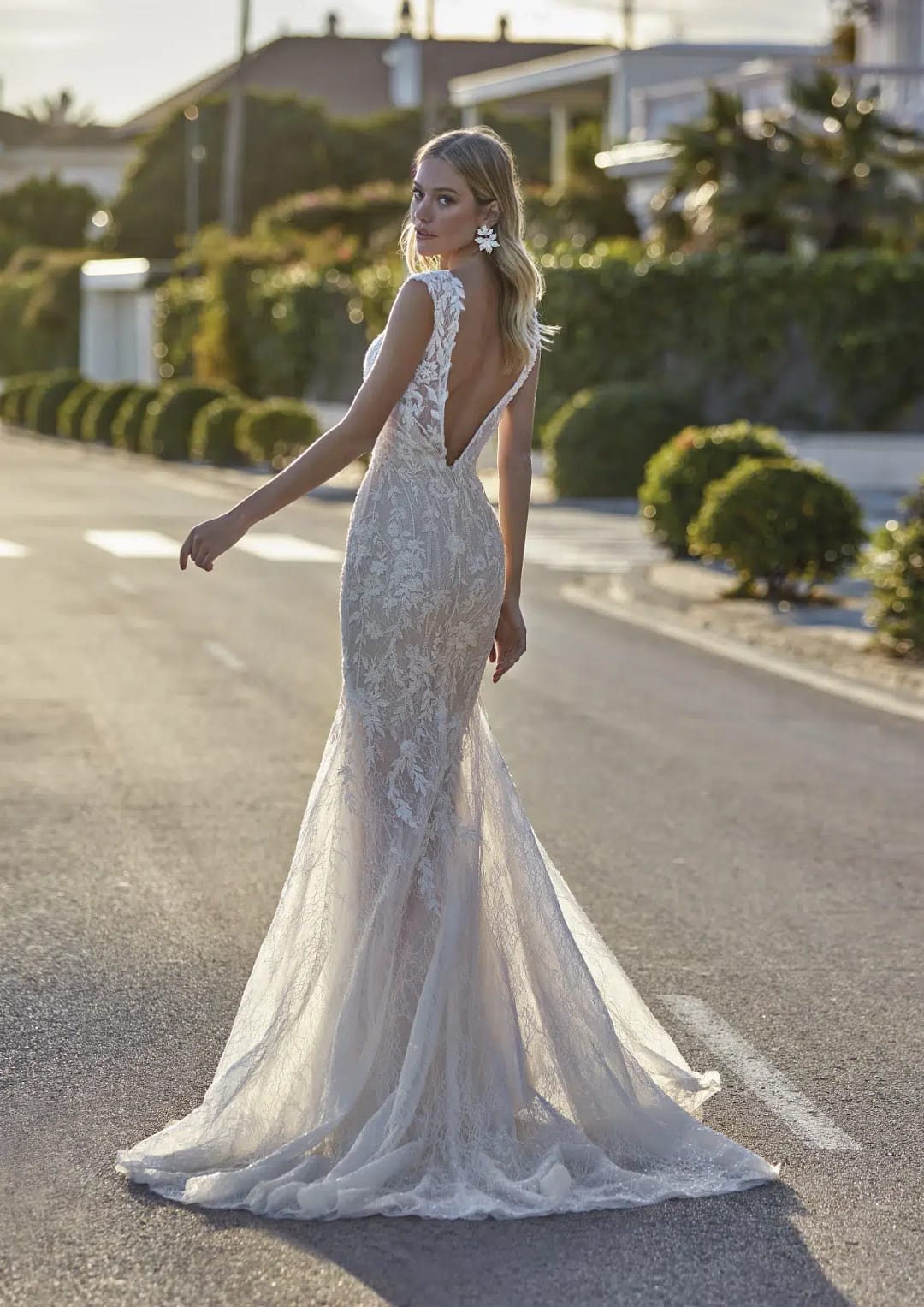Hochzeitskleid aus Meerjungfrau-Spitze mit V-Ausschnitt. Eine Meerjungfrau-Silhouette und dekorative Blumen verschmelzen in diesem wunderschönen Chantilly-Kleid mit Perlenapplikationen. Ein Design, das deine Silhouette betont und mit dem eleganten V-Ausschnitt deine Weiblichkeit hervorhebt.