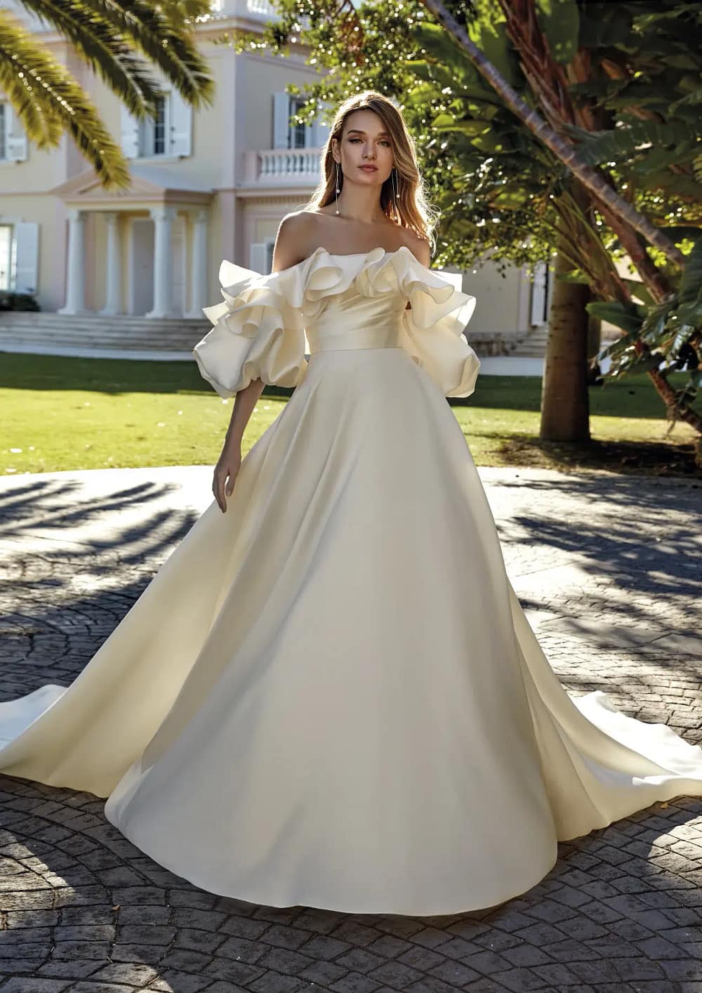Trägerloses Mikado-Hochzeitskleid mit drapierten Ärmeln und Prinzessinnen-Ausschnitt. Elegantes goldenes Mikado-Kleid mit plissiertem Oberteil und originellem Spiel aus Rüschen und Volumen, das mit dem Ausschnitt mit übergroßen, drapierten Ärmeln verschmilzt.