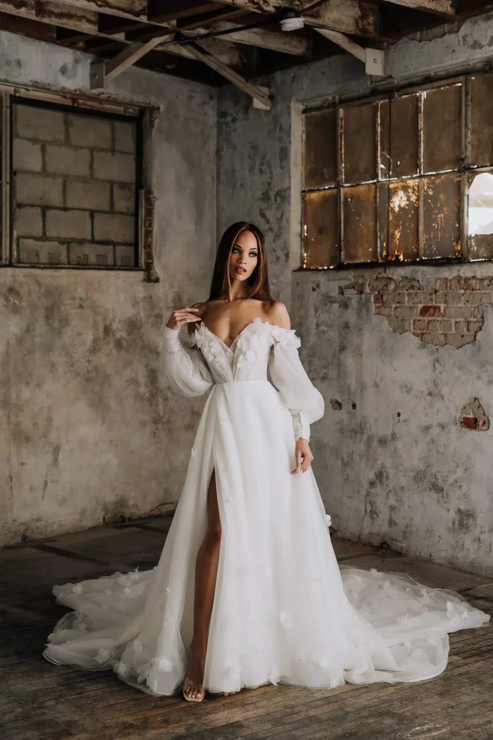 Adrianna ist ein atemberaubendes Brautkleid für dramatische und sexy Bräute, die einen weichen und femininen Look suchen. Das detailverliebte Kleid besteht aus glitzerndem Tüllmaterial, hat einen plissierten Schlitz und vielseitige, abnehmbare Ärmel. Das gerüschte Oberteil, der tiefe Herzchen-Ausschnitt und die feinen 3D-Blumen sorgen für einen skurrilen und verführerischen Effekt. Mit ihrem durchsichtigen Oberteil, dem unsichtbaren Reißverschluss und dem fesselnden Design schafft sie das perfekte Gleichgewicht zwischen Dramatik und Weiblichkeit und sorgt so für eine herausragende Wahl für die moderne Braut.