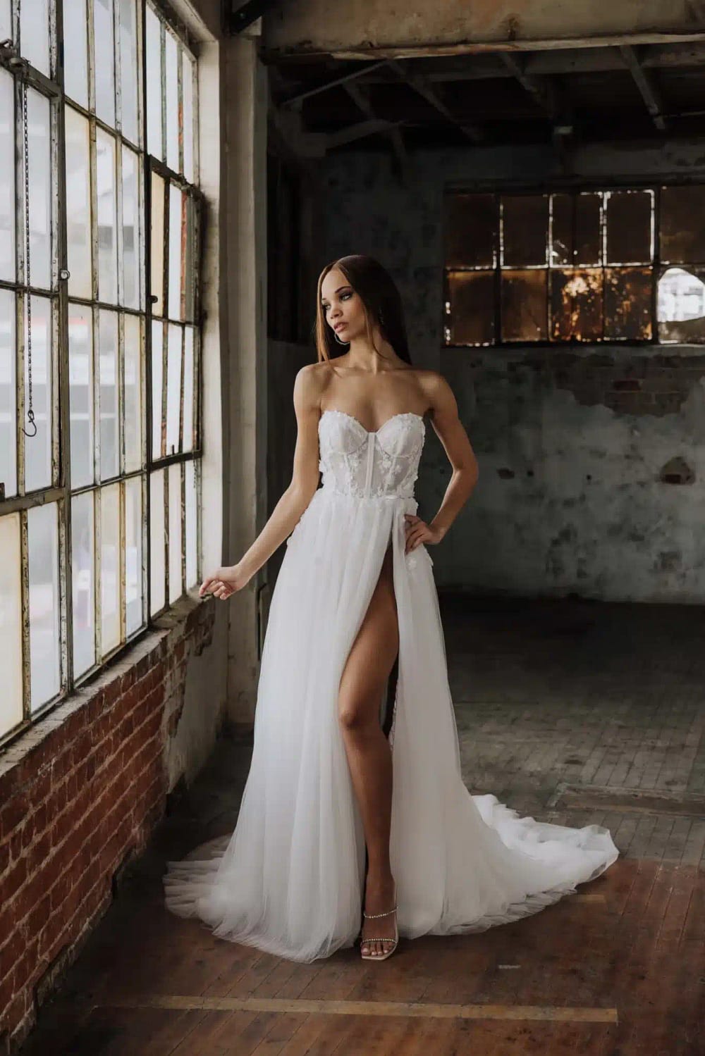 Tali ist ein dramatisches Hochzeitskleid aus weichem, plissiertem Tüll, das eine himmlische Schönheit verkörpert. Das Oberteil mit Bustier ist mit Blumenapplikationen und Perlendetails verziert, die für glamourösen Glanz sorgen. Das durchsichtige Oberteil und das Futter aus Charmeuse sorgen für Verführung und Komfort, während der oberschenkelhohe Schlitz und die gestuften Puffärmel für einen sanften, aber sexy Look sorgen.