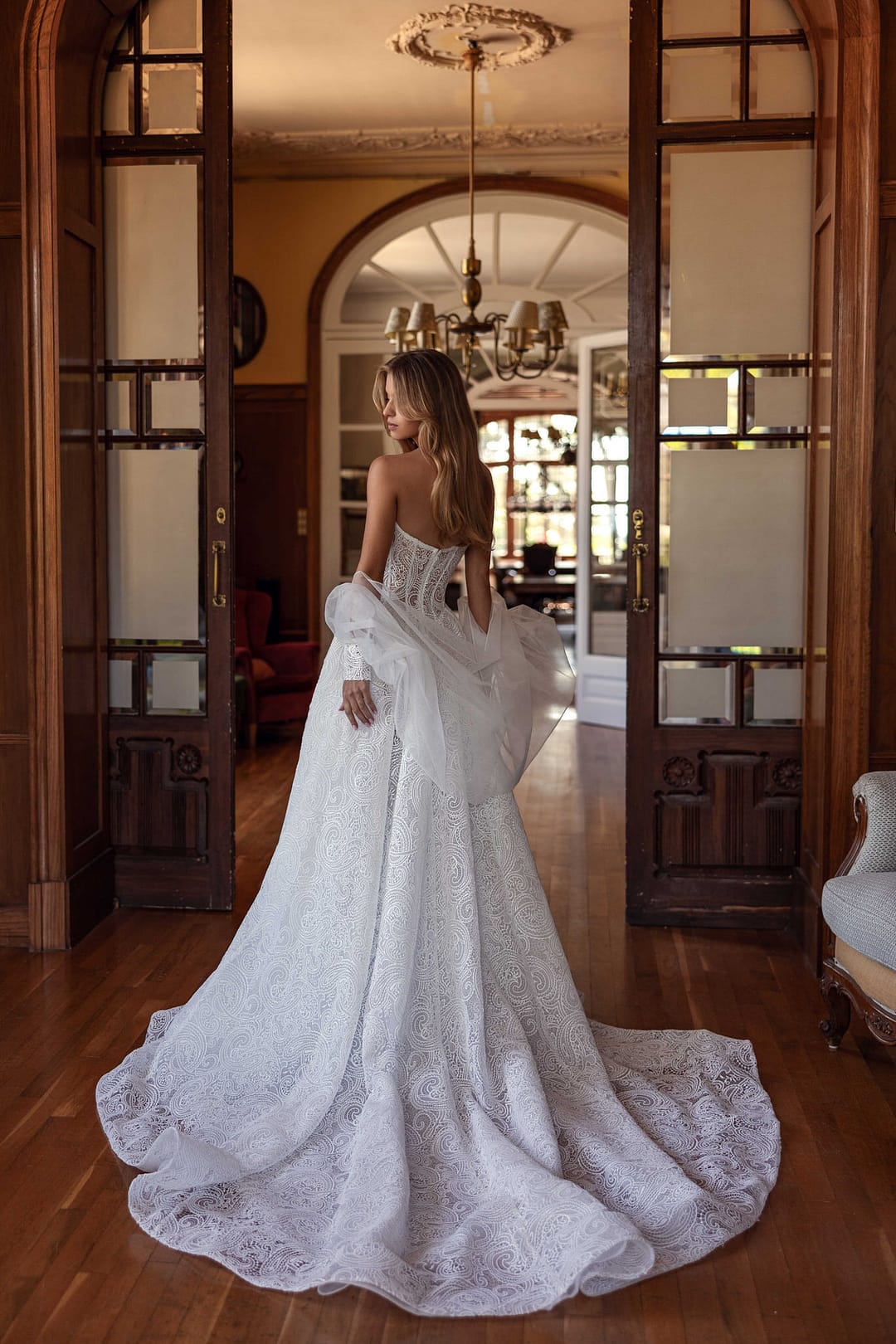 Ein Highlight ist die lange Schleppe, die jedem deiner Schritte einen Hauch von Glamour und Dramatik verleiht. Sie macht „Abelia“ zu einem Kleid, das alle Blicke auf sich zieht und dich wie eine moderne Prinzessin erscheinen lässt.