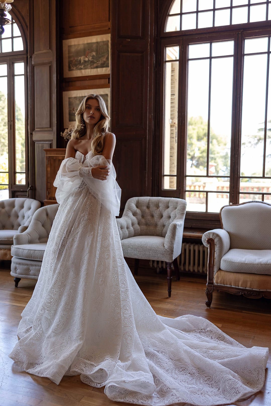 Die elegante A-Linie schenkt dir eine anmutige Silhouette und gleichzeitig Leichtigkeit in jeder Bewegung – ideal, um sowohl den Gang zum Altar als auch die Tanzfläche unbeschwert zu genießen.