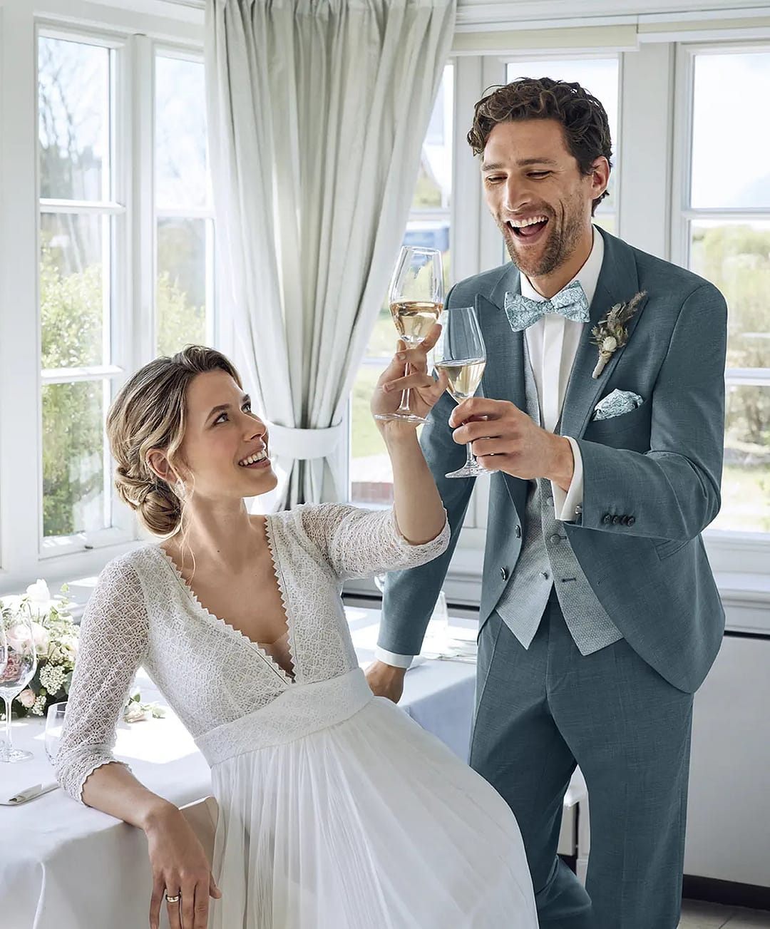 Mit passenden Schuhen, Gürtel sowie Hemd und Manschettenknöpfen von WILVORST runden Sie diesen Hochzeitsanzug Look perfekt ab.
